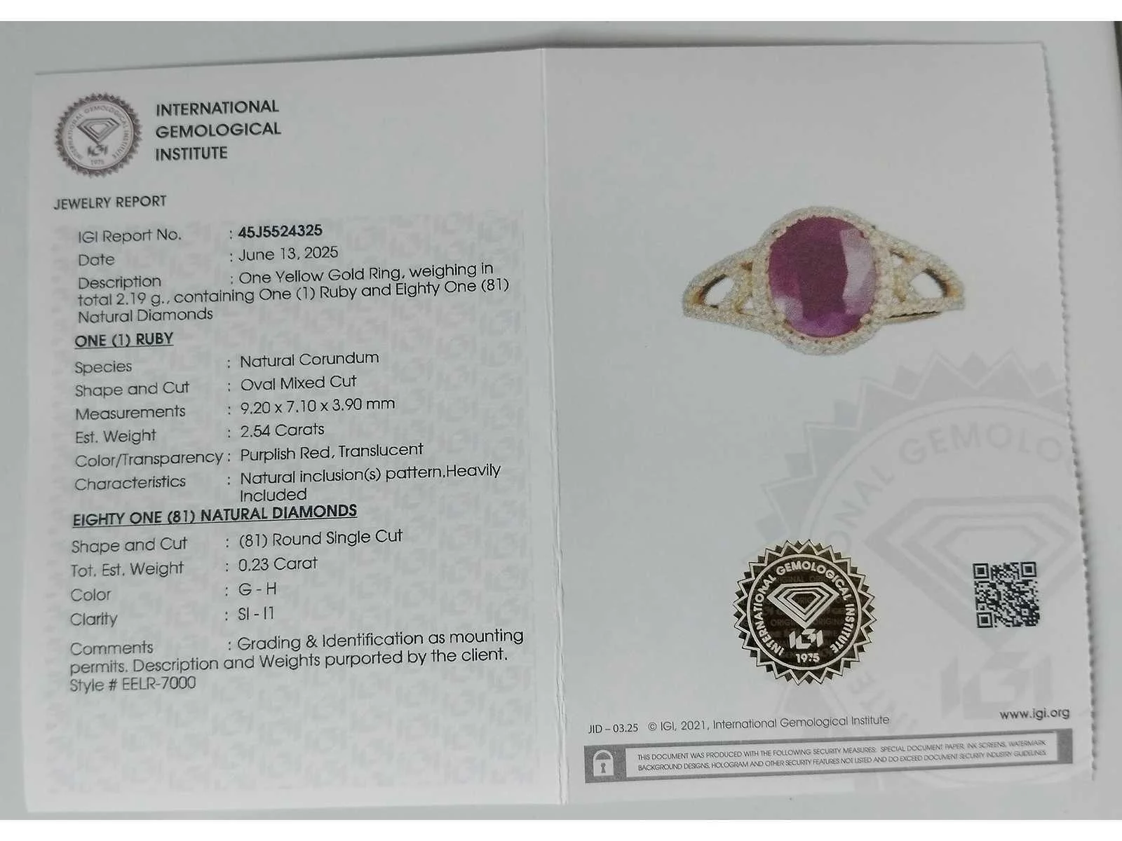 2,77 totale karaat natuurlijke robijnenring van saffier met 14 karaats goud Totaal gewicht 2.189 g - Midden edelsteen natuurlijke korund robijn Edelsteen karaatgewicht: 2,54 karaat Edelsteenafmetingen 9,20X7,10X3,90 mm - Extra edelstenen Natuurlijke diamant - Extra edelsteengewicht 0,23 karaat - Ringmaat (VS): 7/55 Bezichtiging op afspraak Materiaal: Geelgoud Ringmaat : 54 Certificaat: Ja