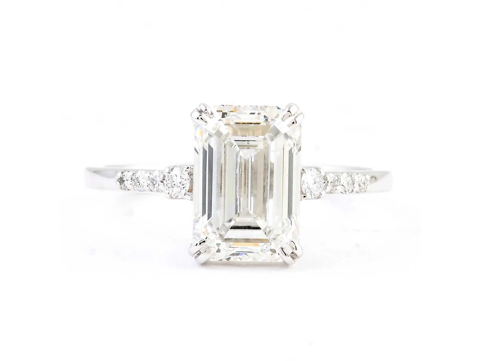 14K Witgoud Hoofdsteen 2.93 Caraat 2 bijstenen met totaal 0.06 Caraat 6 bijstenen met totaal 0.07 Caraat Materiaal: Witgoud Ringmaat : 55 Certificaat: Ja