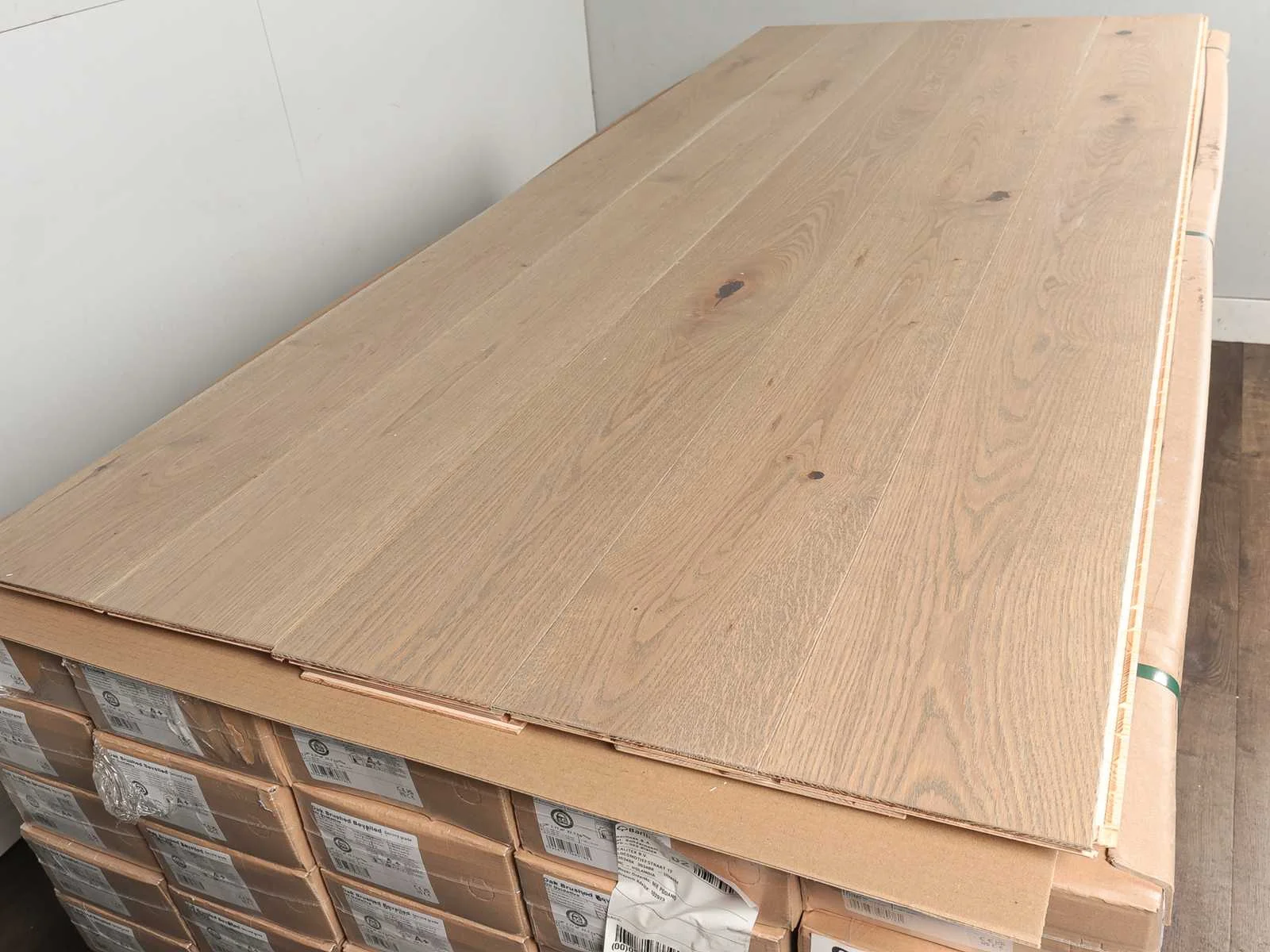 Gemakkelijk te leggen wegens 5G clicksysteem, geschikt voor alle soorten vloer en koelverwarmingen, kwaliteits parketvloer, vloer is van hoogwaardig Europees eiken hout, kant en klaar behandeld, dikte 14 mm, toplaag 3 mm, 20 pakken a 2,77 m2 Merk: Ambiance Product type: Parket Oppervlakte: 55m² Geschikt voor vloerverwarming: Ja V-groef: Ja Afwerking: Mat gelakt, geborsteld, met v-groef Aantal m² per verpakking: 2.77m² Kleur: Beige grey oak 442 Gewicht: 460kg Lengte: 2200mm Breedte: 180mm Materiaal: Eiken multiplank