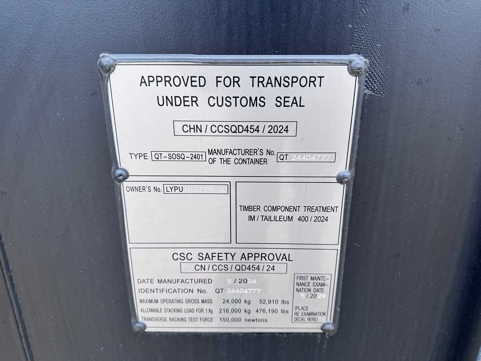 Voorzien van 3 separaat te openen zijdeuren en einddeur, slotkast, maximaal laadvermogen 24 ton, ongebruikt Lengte (ft): 40 High cube: true Eigen gewicht: 4250kg Totale afmeting L: 12192mm Totale afmeting Breedte: 2438mm Totale afmeting Hoogte: 2896mm