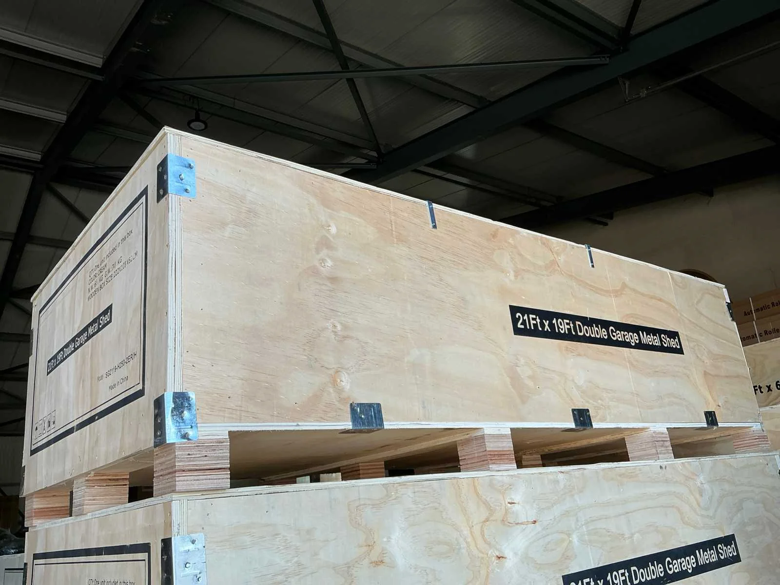 Voorzien van stalen buis 50x50x1,5 mm, stalen buisframe van 20x40x1,2 mm, twee automatische roldeuren en draaideur aan de zijkant, afmeting: 254x230cm, afmeting zijdeur: 86x191 cm, binnenmaat 627x586x380 cm, wandhoogte: 250 cm, spanning elektrische roldeuren: 230 Volt. Merk: Field Industries Type: 2119 Bouwjaar: 2025 Totaal oppervlakte: 38m² Totale afmeting L: 6540mm Totale afmeting Breedte: 5860mm Totale afmeting Hoogte: 3800mm Eigen gewicht: 780kg