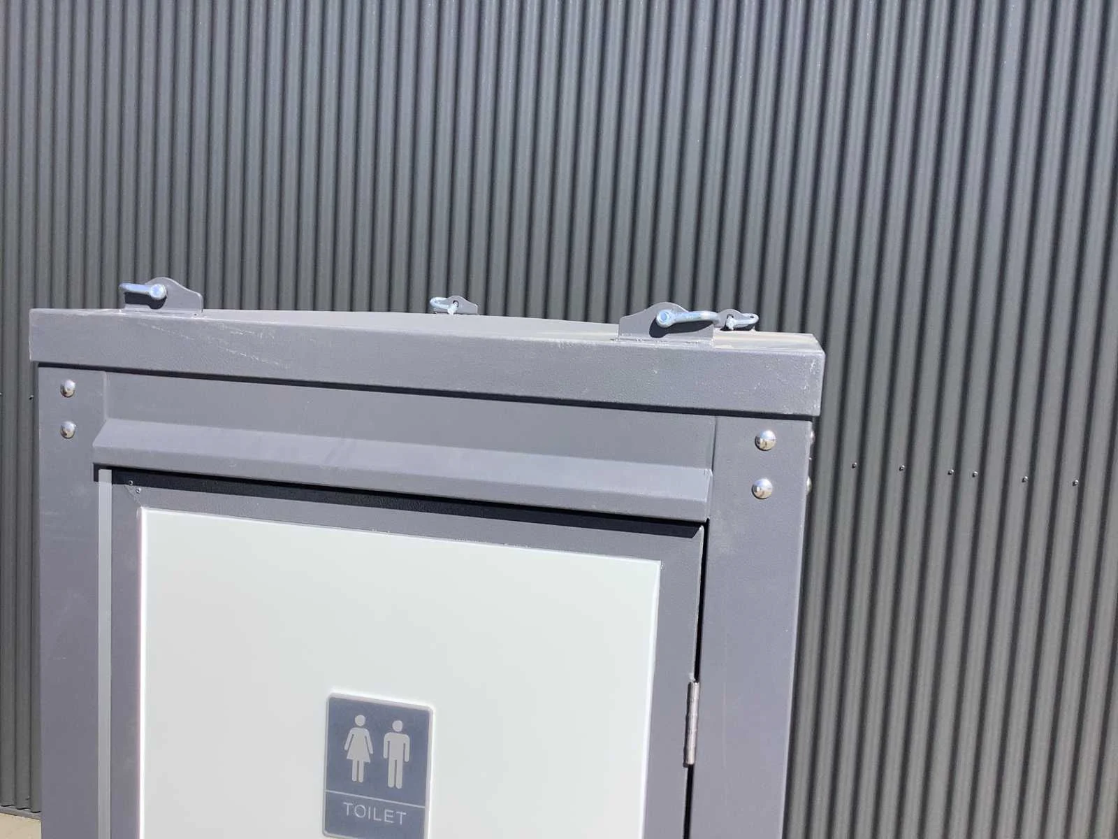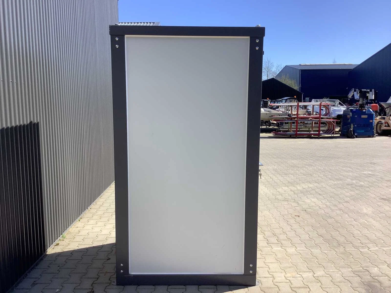 Voorzien van toilet, wastafel, toiletborstel, toiletrolhouder, ventilator, 230 Volt elektra aansluiting, afsluitbaar met sleutel en knopcilinder, lepelgaten, hijsogen Merk: Field Gewicht: 270kg Lengte: 1310cm Breedte: 1100cm Hoogte: 2360cm