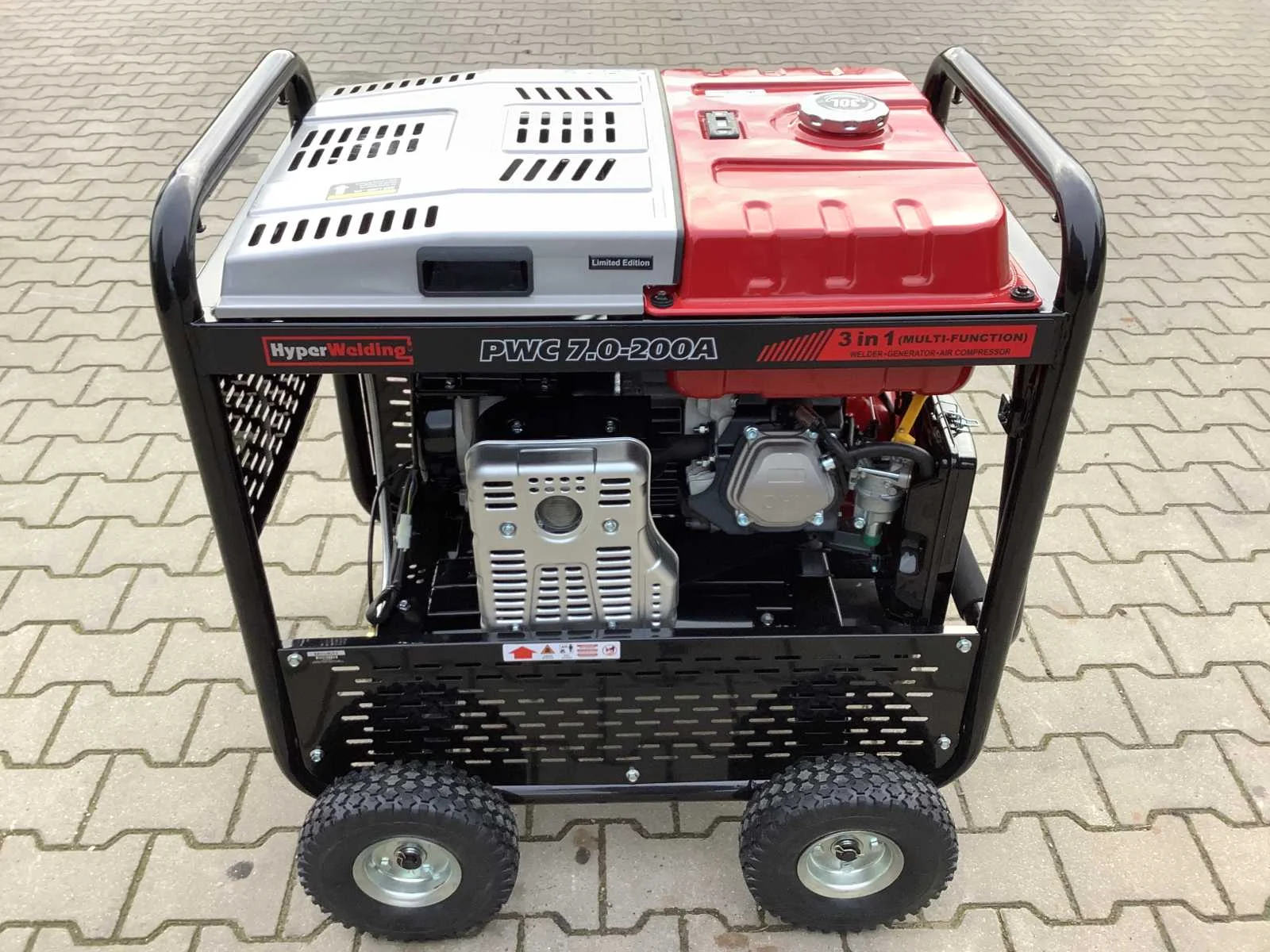 3-in-1 mobiel werkstation met 5,5 kVA stroomgenerator met 230 Volt outlet, klein/groot (= functie 1), lasapparaat met 200 Ampère stroomsterkte (= functie 2); 1,35 kW luchtcompressor, 10 liter tankinhoud, 8 Bar (= functie 3). voorzien van 420 cm3 benzinemotor; elektrische start + trekstart; wordt geleverd inclusief 12 Volt startaccu; diverse toebehoren; handboek; ongebruikt Merk: Hyper Welding Type: PWC 7.0-200A Multi-Function Bouwjaar: 2025 Handboek aanwezig: true