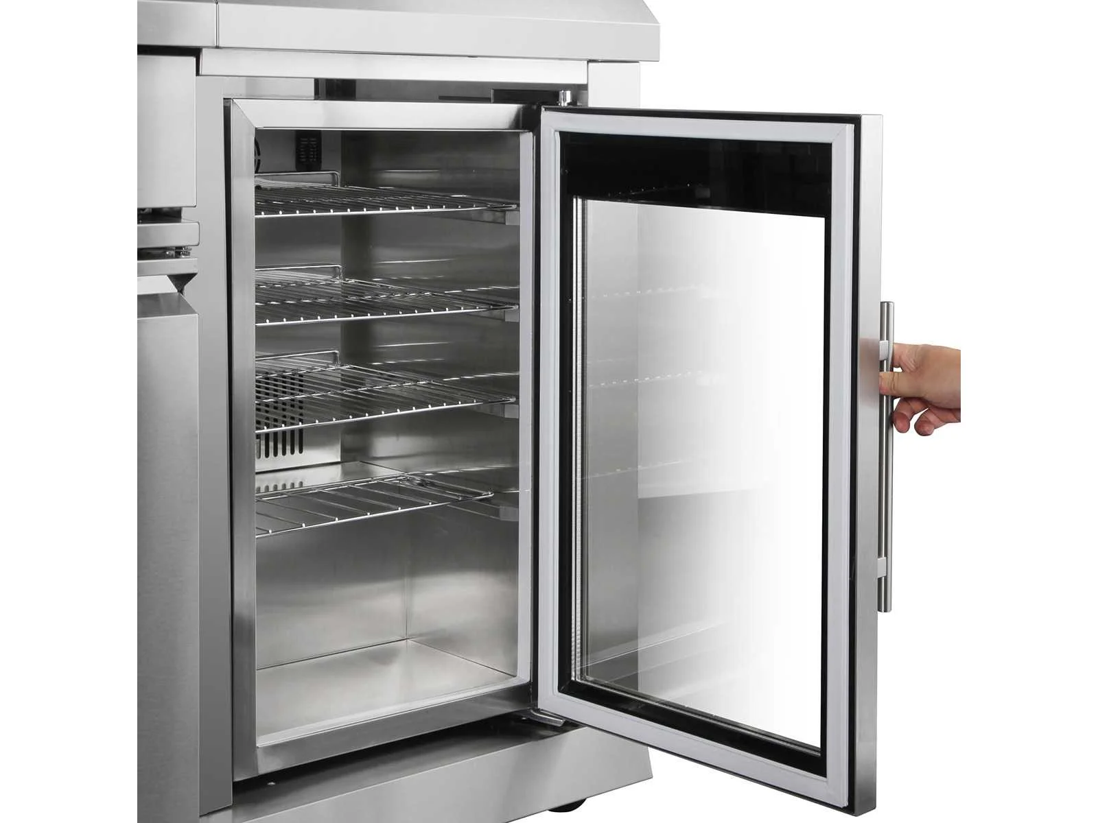 Modulair systeem, bestaande uit: RVS roestvrijstalen barbecue/grill, koelkast, spoelbak + keukenkraan, diverse kast- en opbergruimte. Merk: Field Outdoor Model: De Luxe Stainless Product type: #2 Lengte: 59cm Breedte: 262cm Hoogte: 121cm Materiaal: RVS
