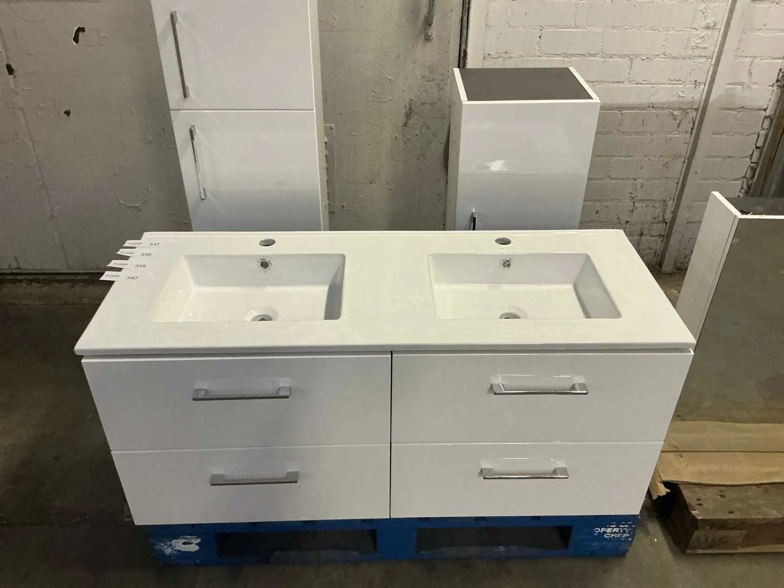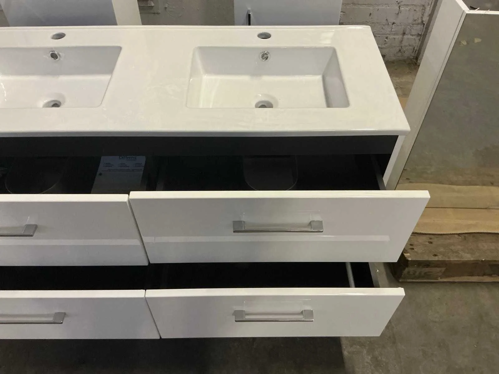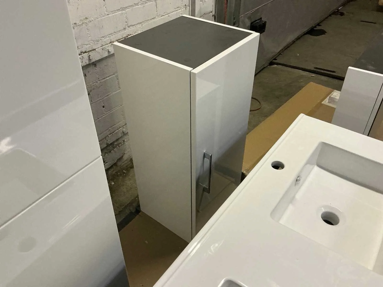 Bestaande uit duo wastafel 120cm, hangkast hoog 35x35x160cm, hangkast laag 35x35x80cm, spiegelkast 120x70cm. Zowel Chrome als zwarte handgrepen aanwezig. Merk: Differnz Breedte: 120cm Kleur: Glans wit Spiegelkast: true Onderkast: 120x52cm Lades: 4 Softclose: true