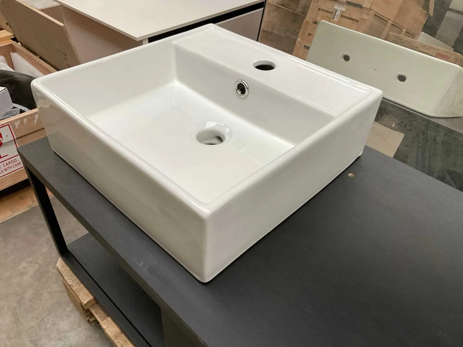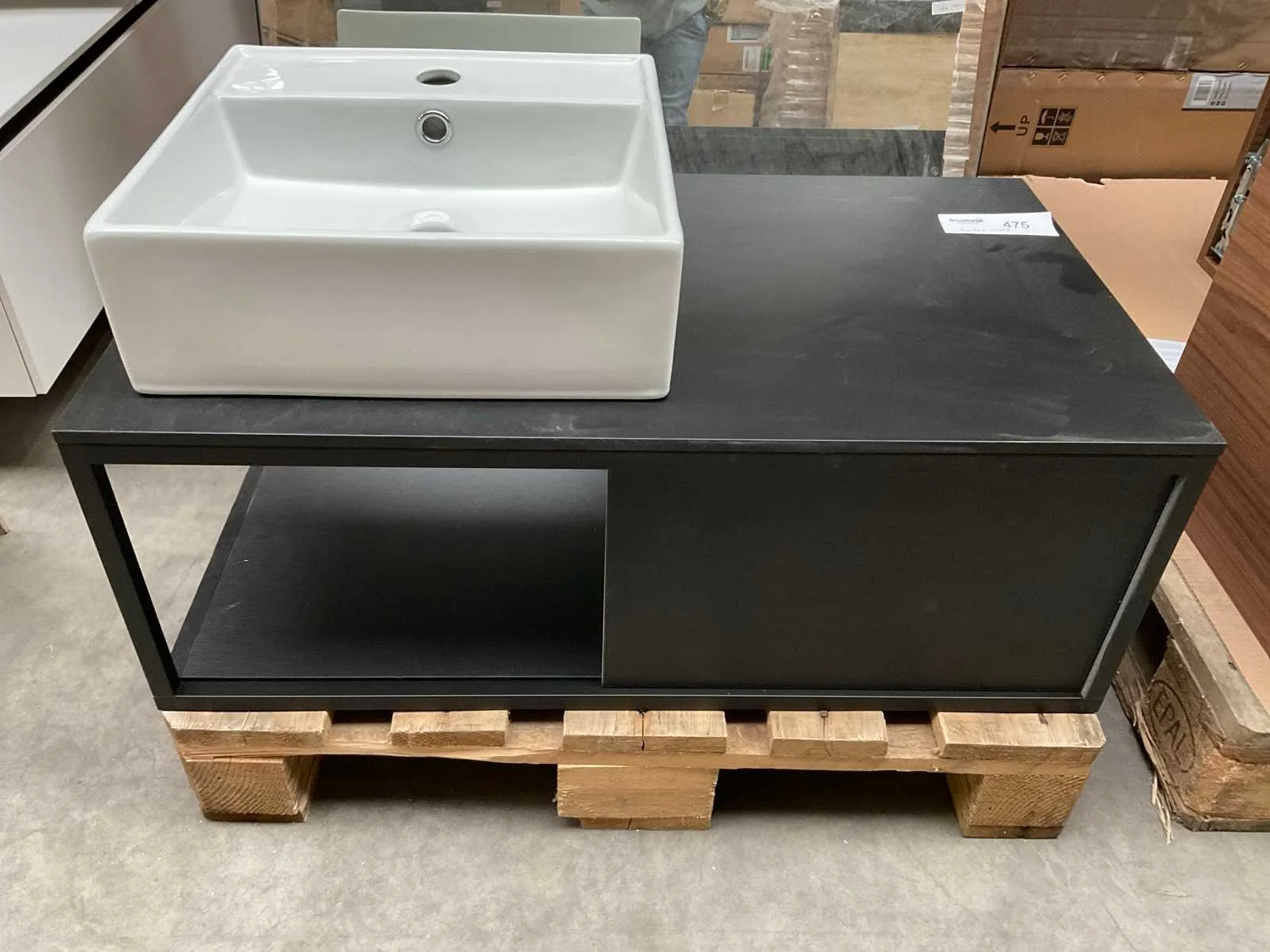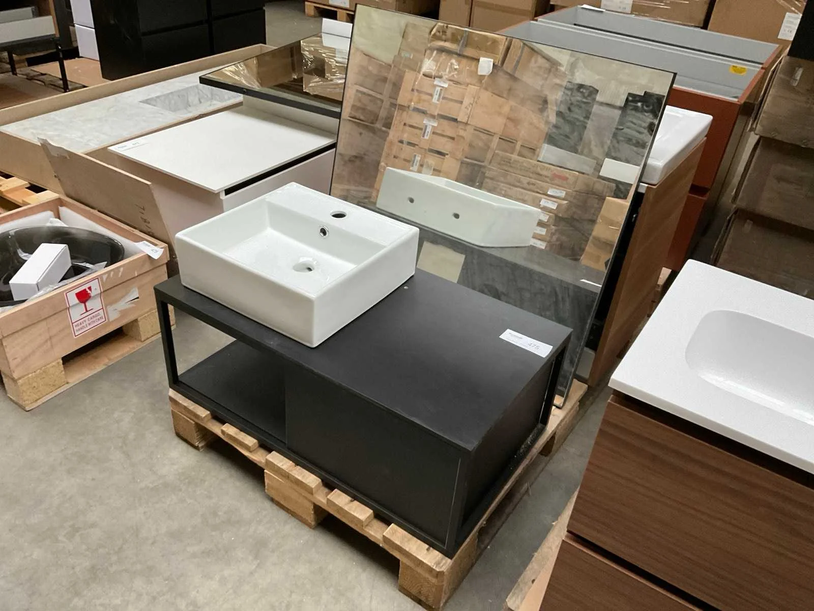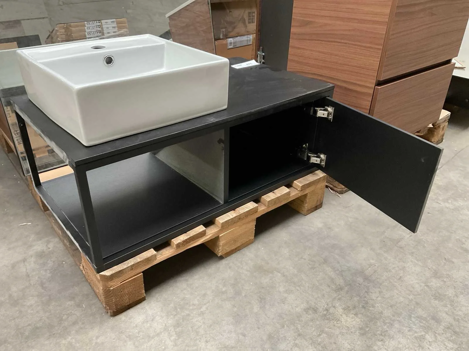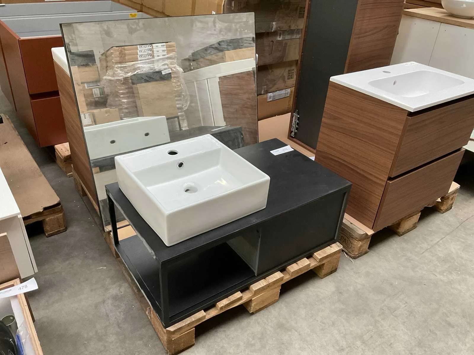 Showmodel wastafelmeubel voorzien van deur, wastafel en spiegel Hoogte: 29cm Lengte: 80cm Breedte: 46cm Wastafel: 38x38x13 cm Spiegel: 80x80 cm