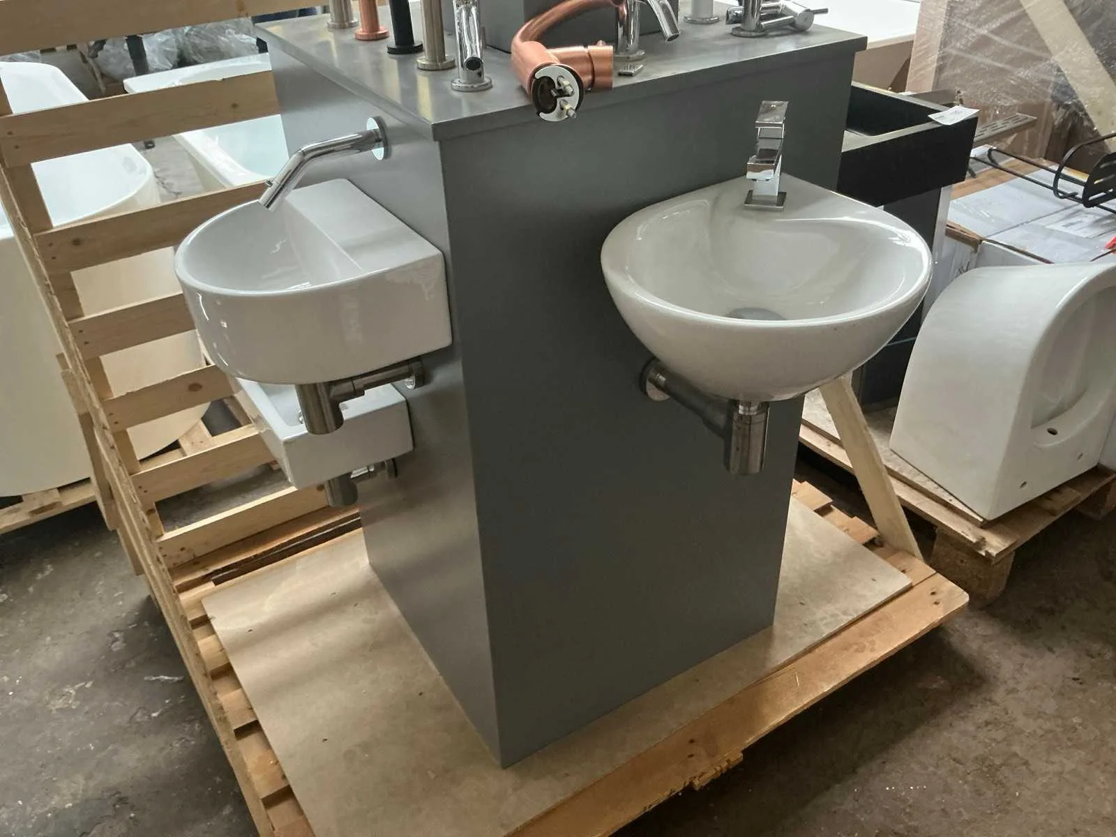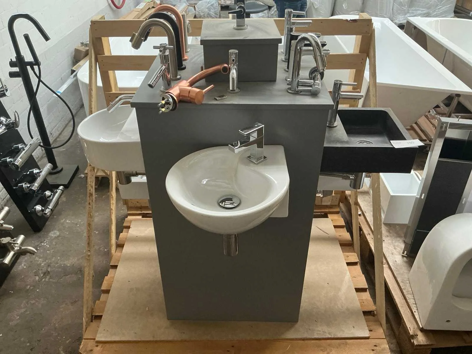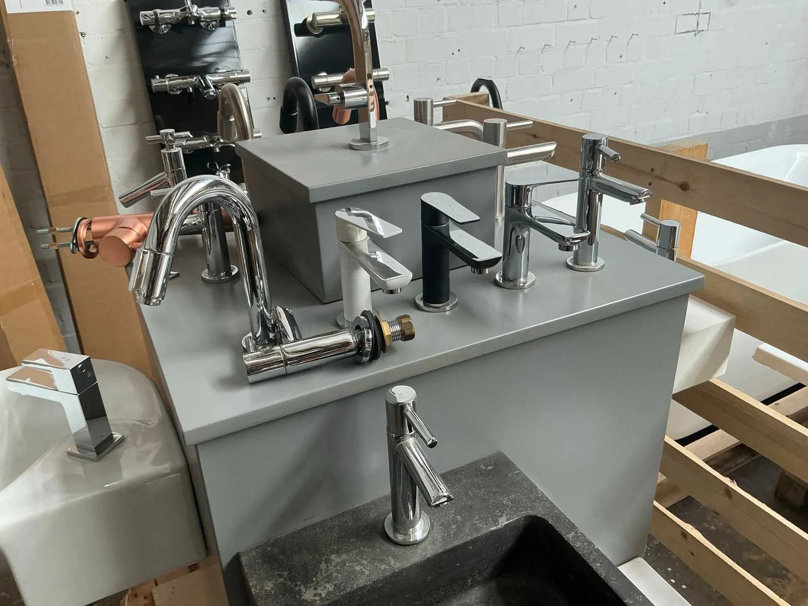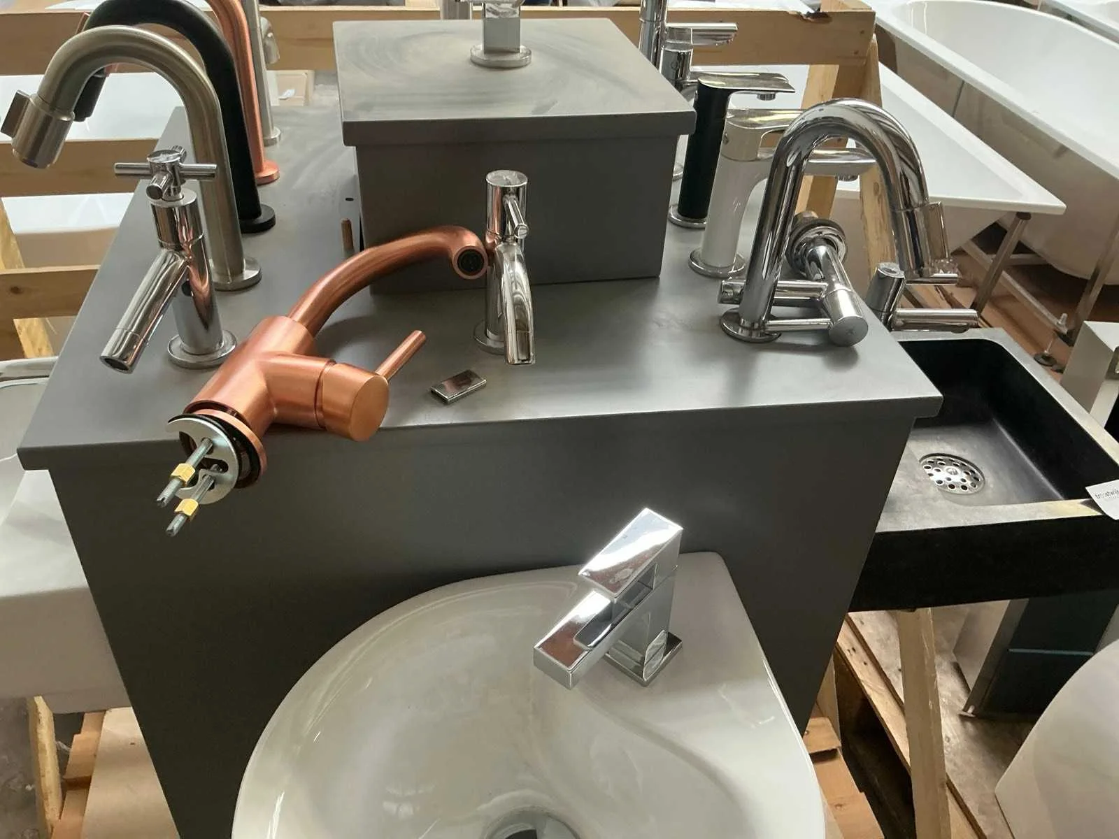 Houten meubel voorzien van diverse demo kranen en fontein sets Breedte: 100cm Hoogte: 120cm