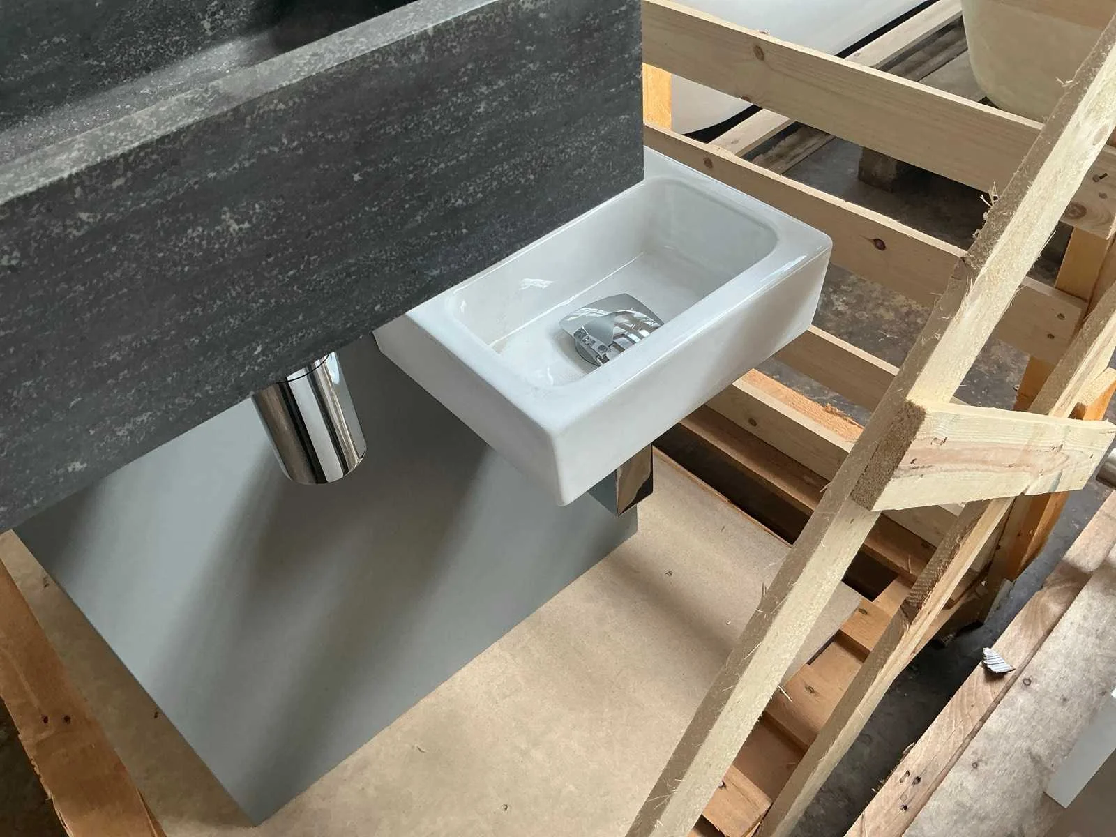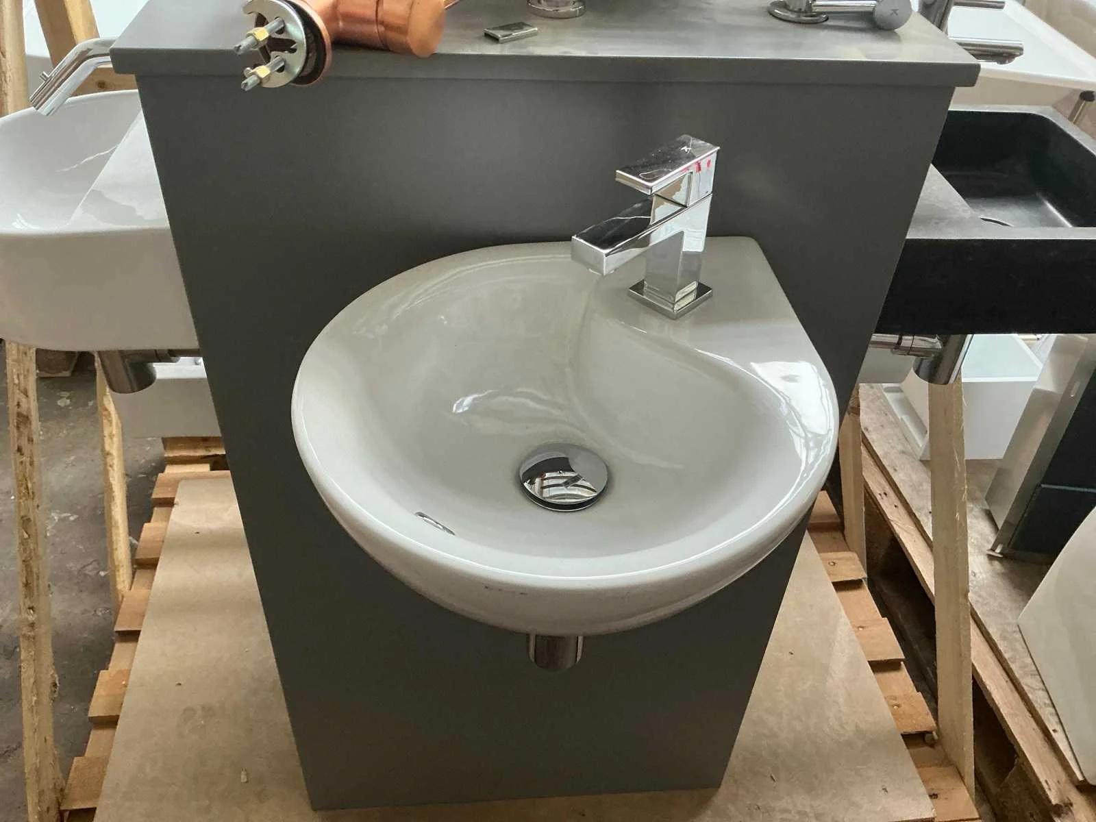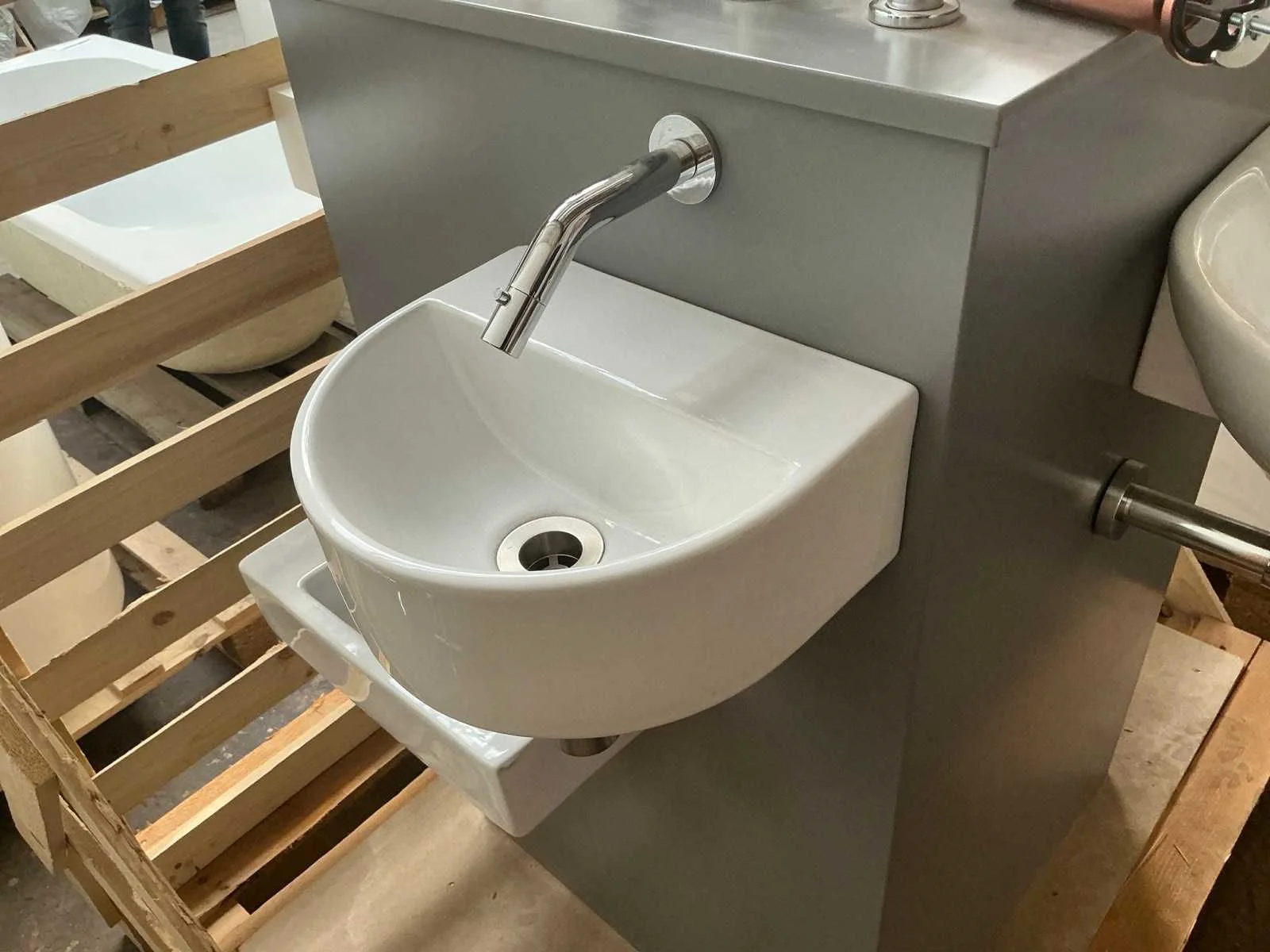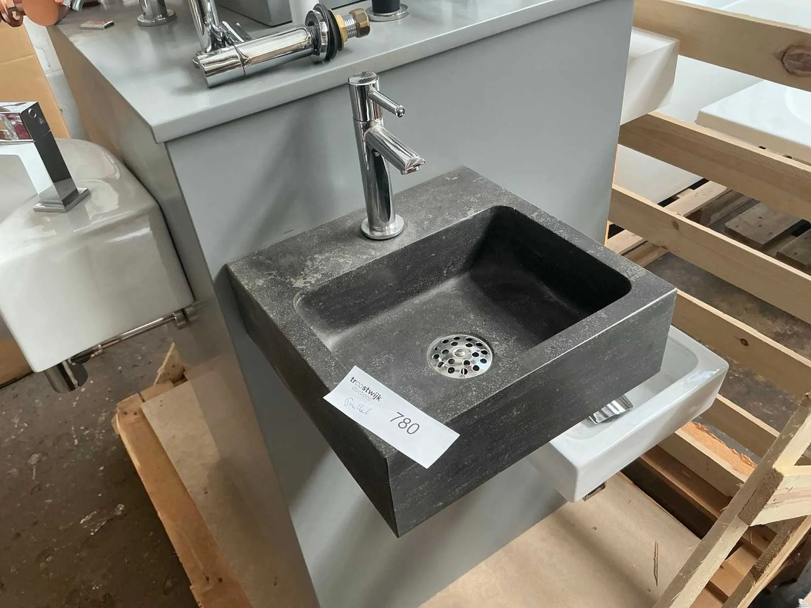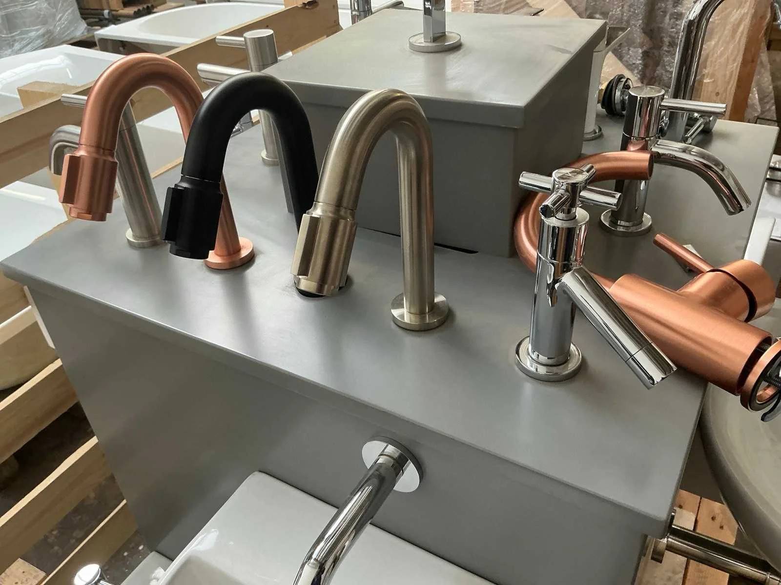 Houten meubel voorzien van diverse demo kranen en fontein sets Breedte: 100cm Hoogte: 120cm