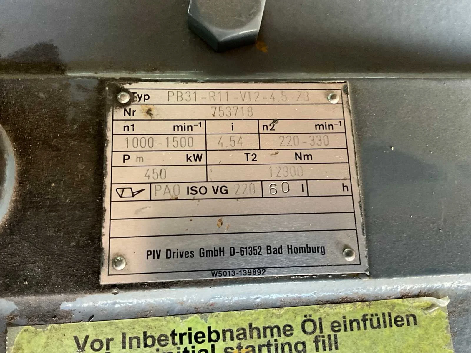Gewicht circa: 1312 kg, toerental van: 1000 tot 1500 rpm naar 220 tot 330 rpm, as Ø circa: 100 mm en 140 mm Merk: PIV Product type: PB31-R11-V12-4.5-Z3 Vermogen: 450kW Lengte: 125cm Breedte: 120cm Hoogte: 95cm