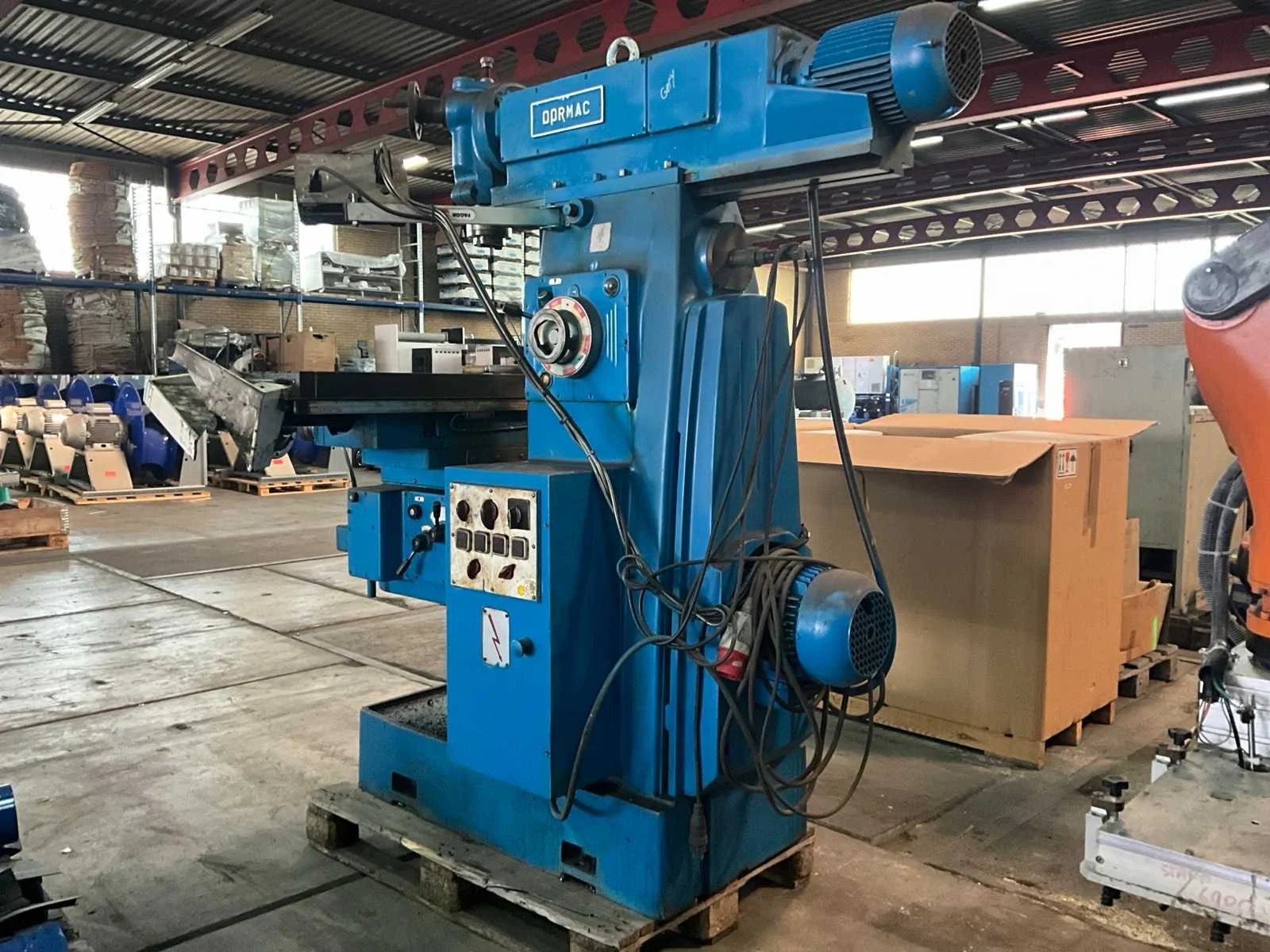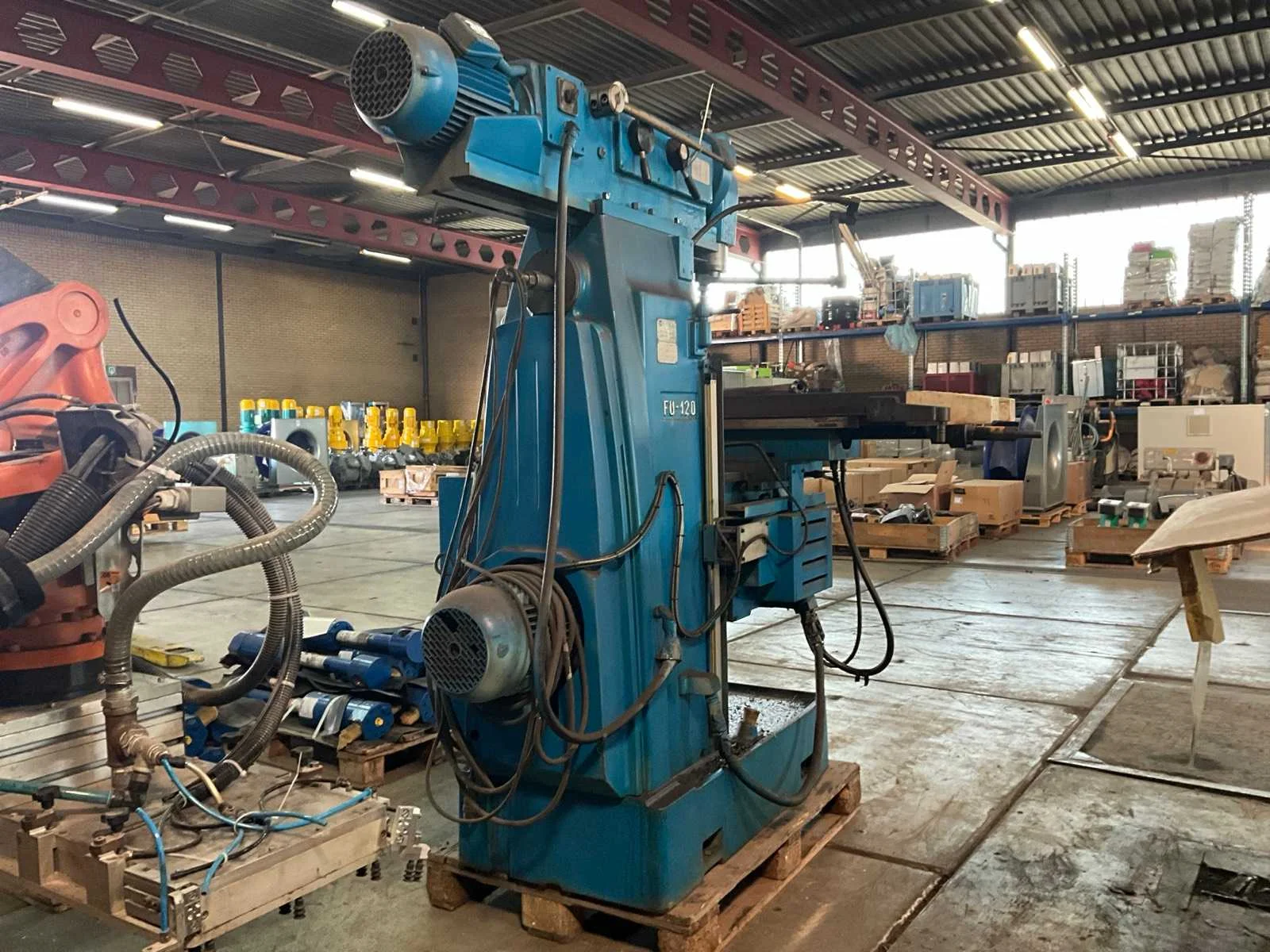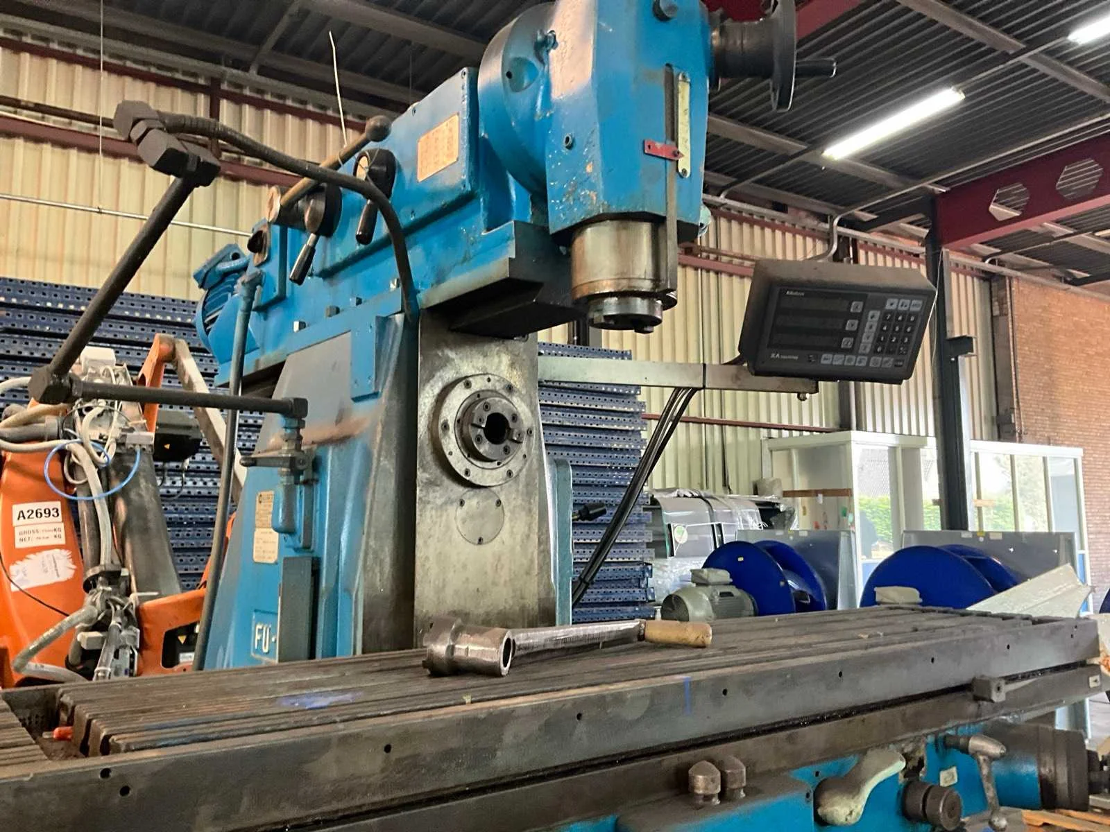Merk: Dormac Type: FU-120 Bouwjaar: 1978 Verplaatsing x-as: 950mm Verplaatsing y-as: 400mm Verplaatsing z-as: 600mm Opname: 40 mm Aantal snelheden: 8 Snelheid van n =: 38rpm Snelheid tot n =: 1500rpm T-gleuf opspantafelafmeting L: 1300mm T-gleuf opspantafelafmeting B: 300mm Besturing, merk, type: Mitutoya Aansluiting: 400V Afmeting l: 1850mm Afmeting b: 1750mm Afmeting h: 2100mm