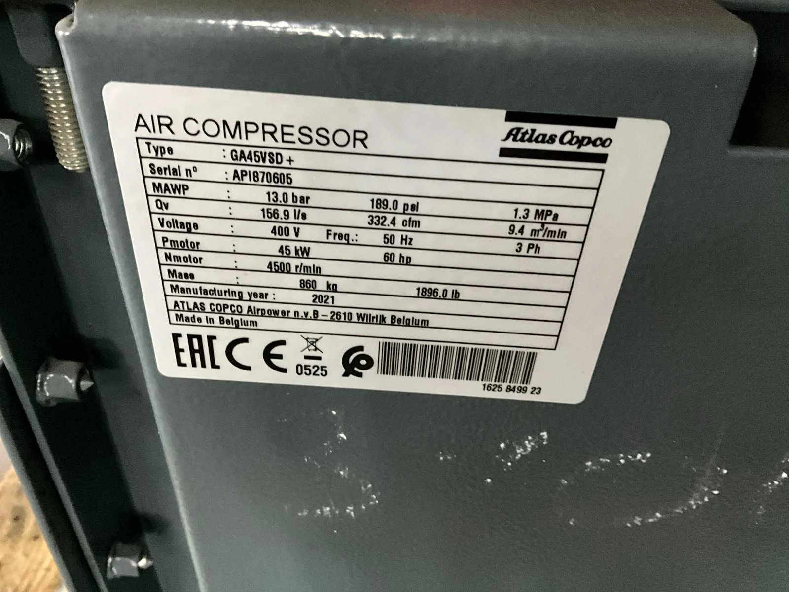 Merk: Atlas copco Type: GA45VSD+ Vermogen: 45kW