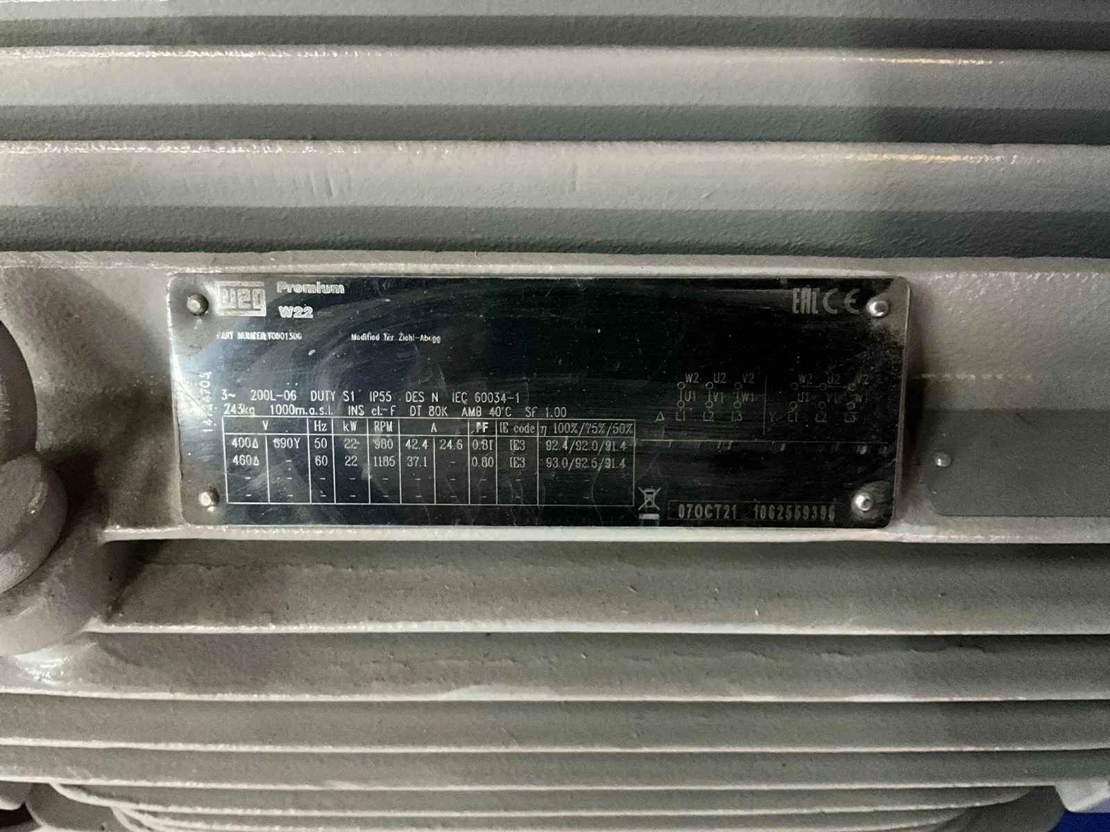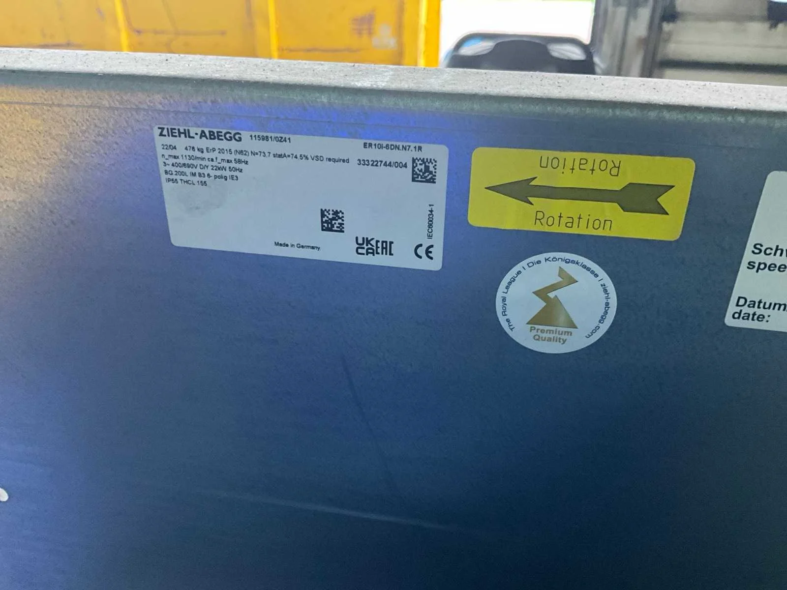 Flens maat circa: 118x118 cm, 1130 rpm, 400/690V, vermogen: 22 kW Merk: Zielh-Abegg Product type: ER101-6DN.N7.1R Gewicht: 476kg Lengte: 136cm Breedte: 118cm Hoogte: 126cm