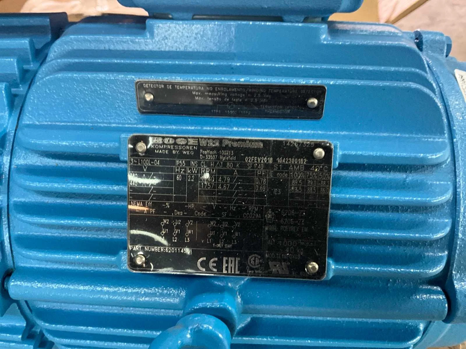 Toerental: 1740/1757 rpm, as Ø circa: 27 mm Merk: WEG / Boge Product type: 3-L100L-04. Aansluiting: 400V Motorvermogen (kW): 2.2kW Lengte: 43cm Breedte: 20cm Hoogte: 27cm