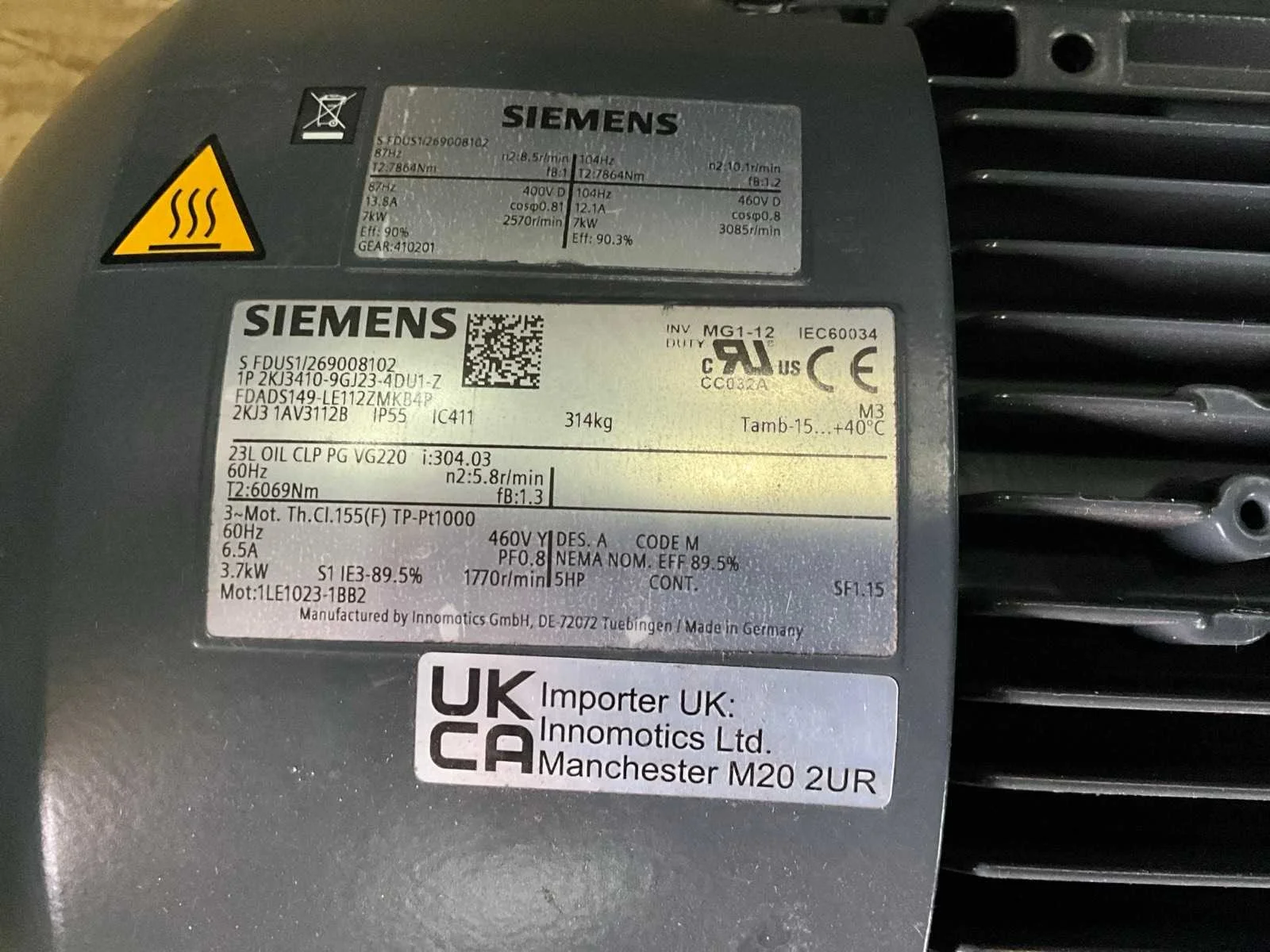 Toerental: 2570 rpm, as Ø circa: 31 mm Merk: Siemens Product type: SFDUS1/269008102 Aansluiting: 400V Motorvermogen (kW): 7kW Lengte: 45cm Breedte: 40cm Hoogte: 40cm