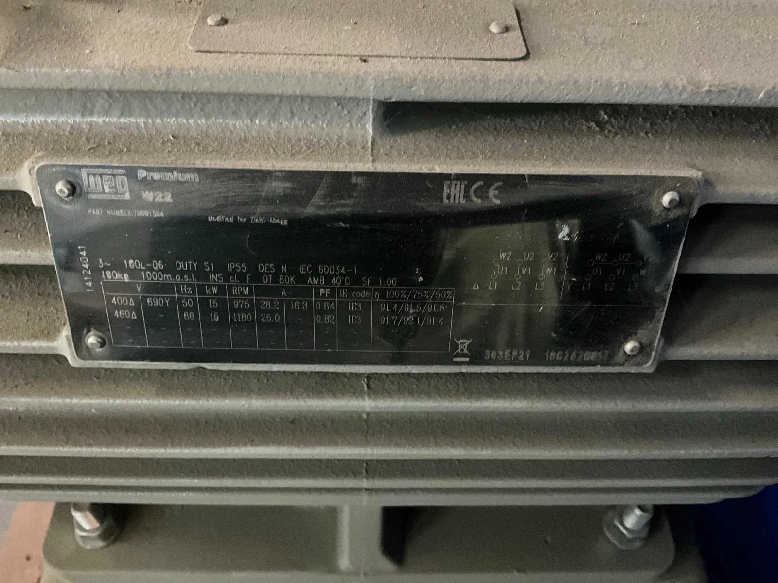 Flens maat circa: 118x118 cm, 1230 rpm, 400/690V, vermogen: 15 kW Merk: Zielh-Abegg Product type: ER901-6DN.M7.1R Gewicht: 381kg Lengte: 136cm Breedte: 118cm Hoogte: 126cm