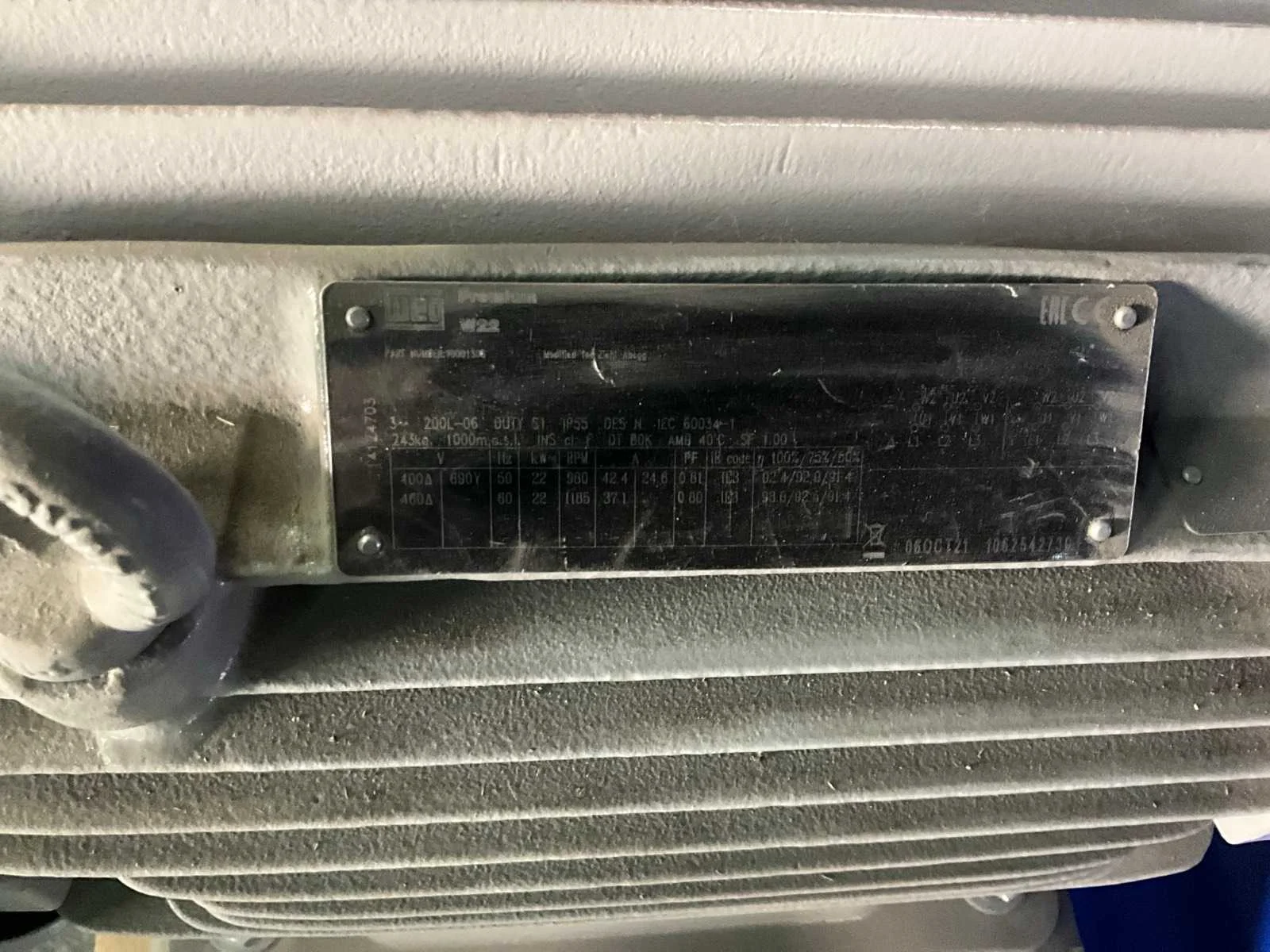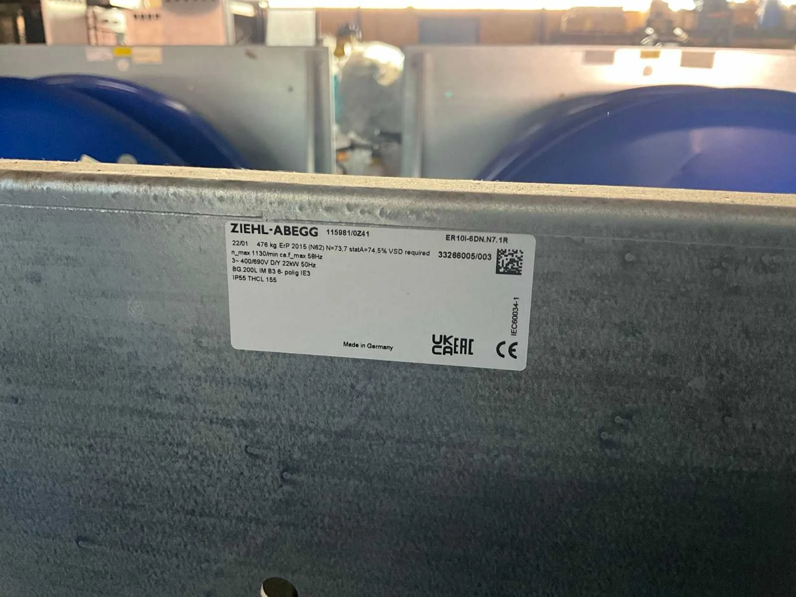 Flens maat circa: 118x118 cm, 1130 rpm, 400/690V, vermogen: 22 kW Merk: Zielh-Abegg Product type: ER101-6DN.N7.1R Gewicht: 476kg Lengte: 136cm Breedte: 118cm Hoogte: 126cm