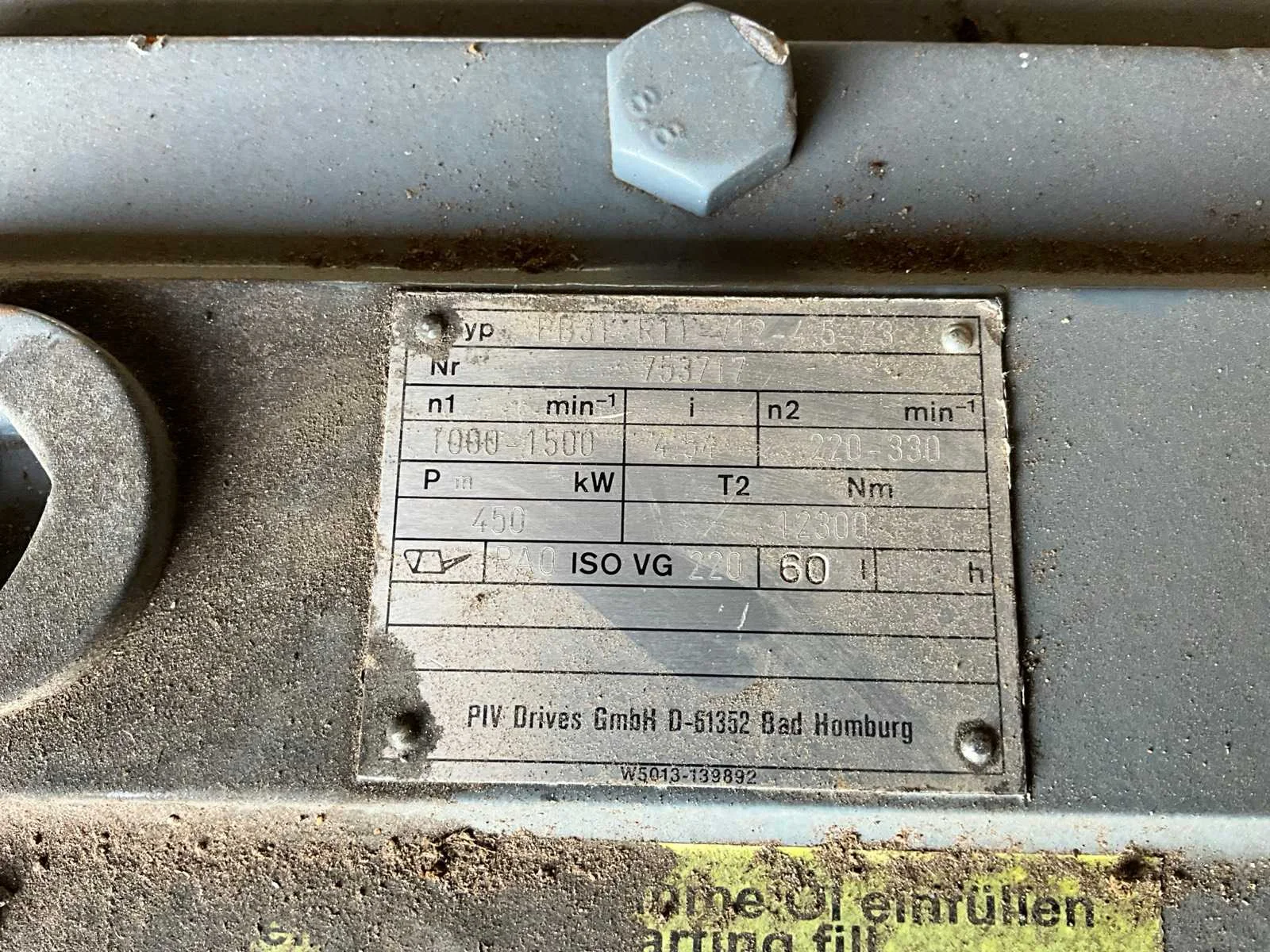 Gewicht circa: 1312 kg, toerental van: 1000 tot 1500 rpm naar 220 tot 330 rpm, as Ø circa: 100 mm en 140 mm Merk: PIV Product type: PB31-R11-V12-4.5-Z3 Vermogen: 450kW Lengte: 125cm Breedte: 120cm Hoogte: 95cm