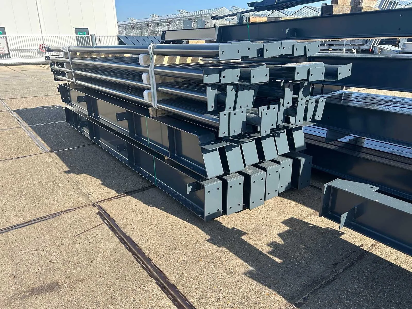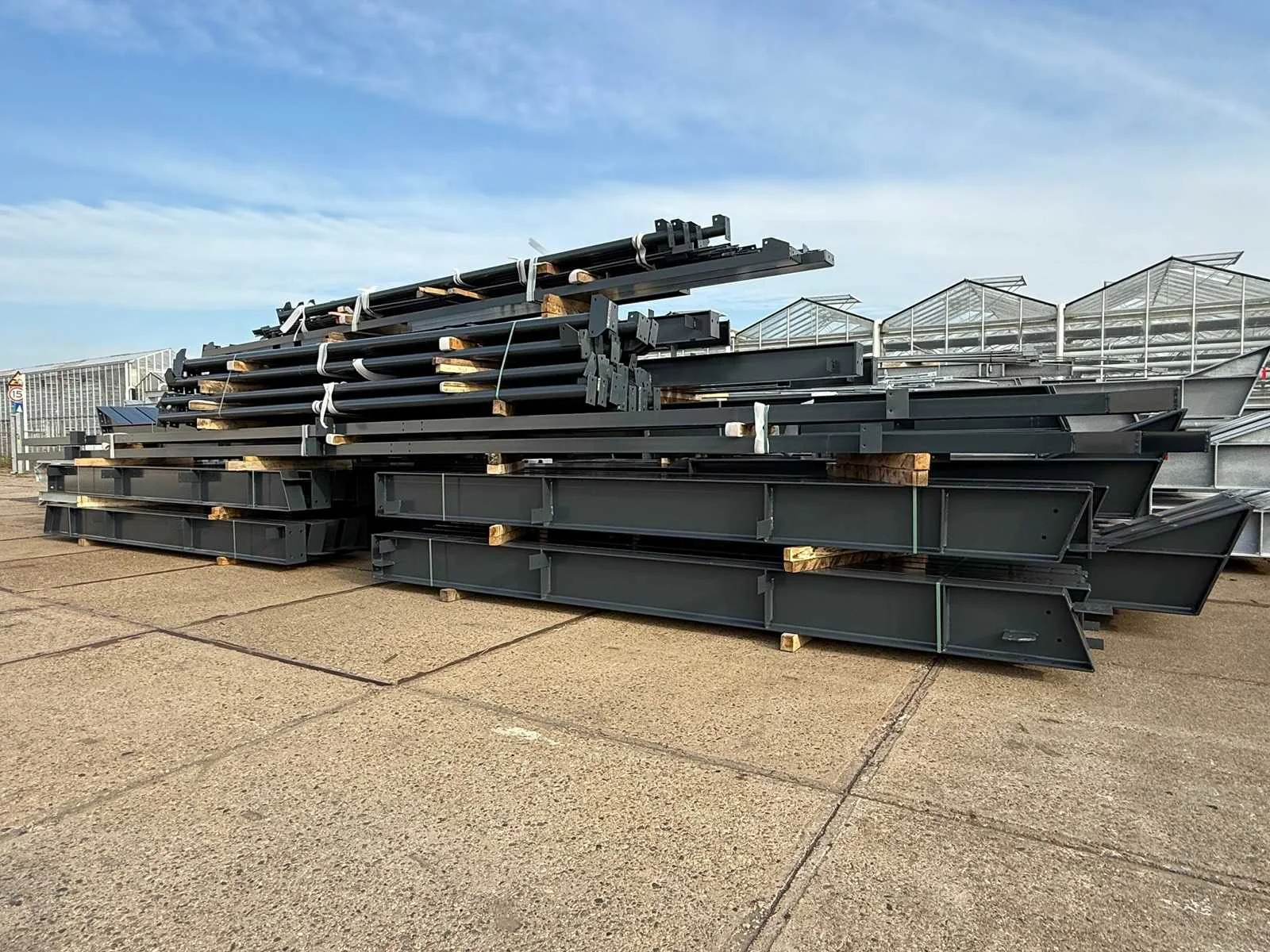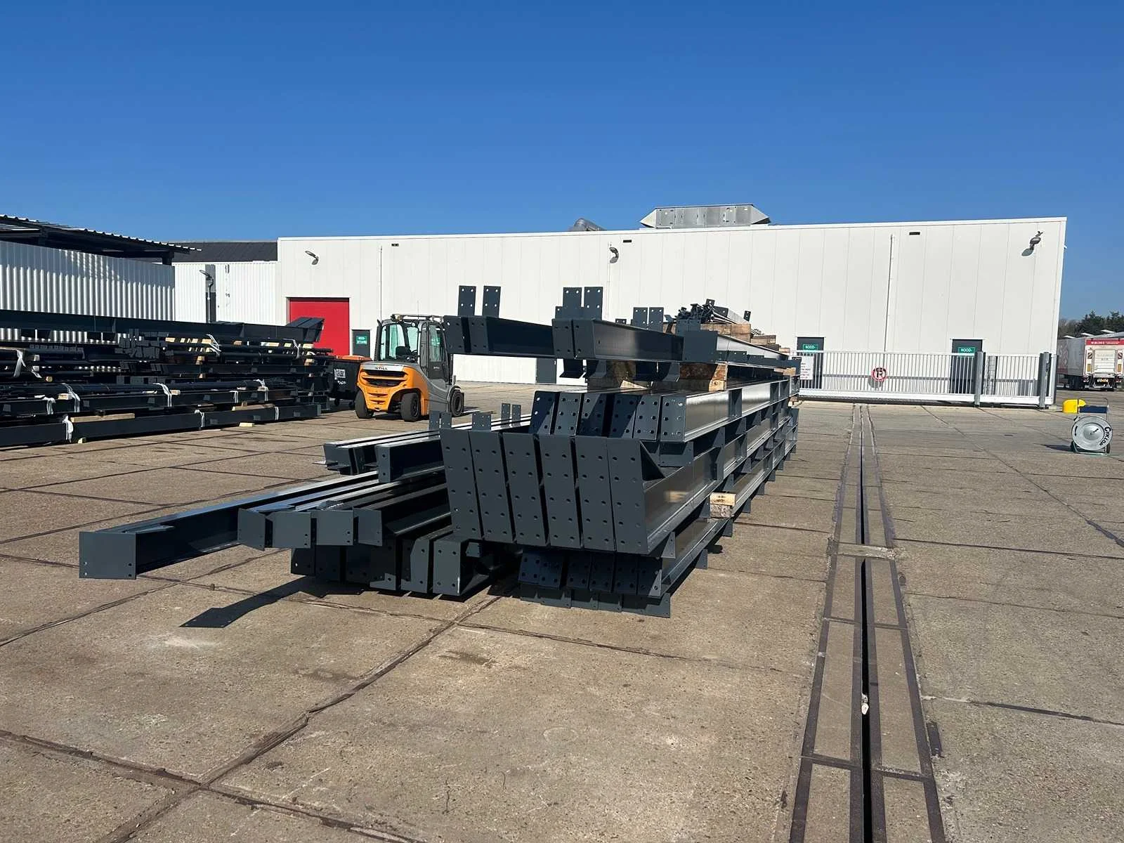 Nederlandse productie; vrije overspanning; spanten h.o.h. 5000mm; staalberekeningen; staaltekeningen; montagetekeningen; ankerplan; staal genummerd volgens montageplan; dakhelling 20 graden; 9 sets tussenspanten IPE330/270; 2 sets eindspanten IPE 220/200/180 met windstijlen waarvan 1 set voorzien is van een deursparing UNP220; voorzien van drukkokers; windverbanden; gordinglippen; bouten en moeren; meestort ankers; staalconstructie volgens productnorm EN1090 (Certificaat na aankoop verkrijgbaar); kavel ligt netjes transportklaar en dient met 1 trailer opgehaald te worden; kavel wordt gratis met een heftruck geladen Materiaal: Gepoedercoat staal antraciet Bouwjaar: 2025 Totaal oppervlakte: 1100m² Nok hoogte: 8504mm Goot hoogte: 4500mm Totale afmeting L: 50000mm Totale afmeting Breedte: 22000mm
