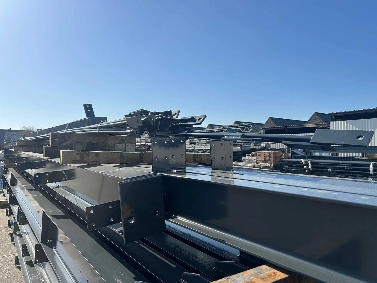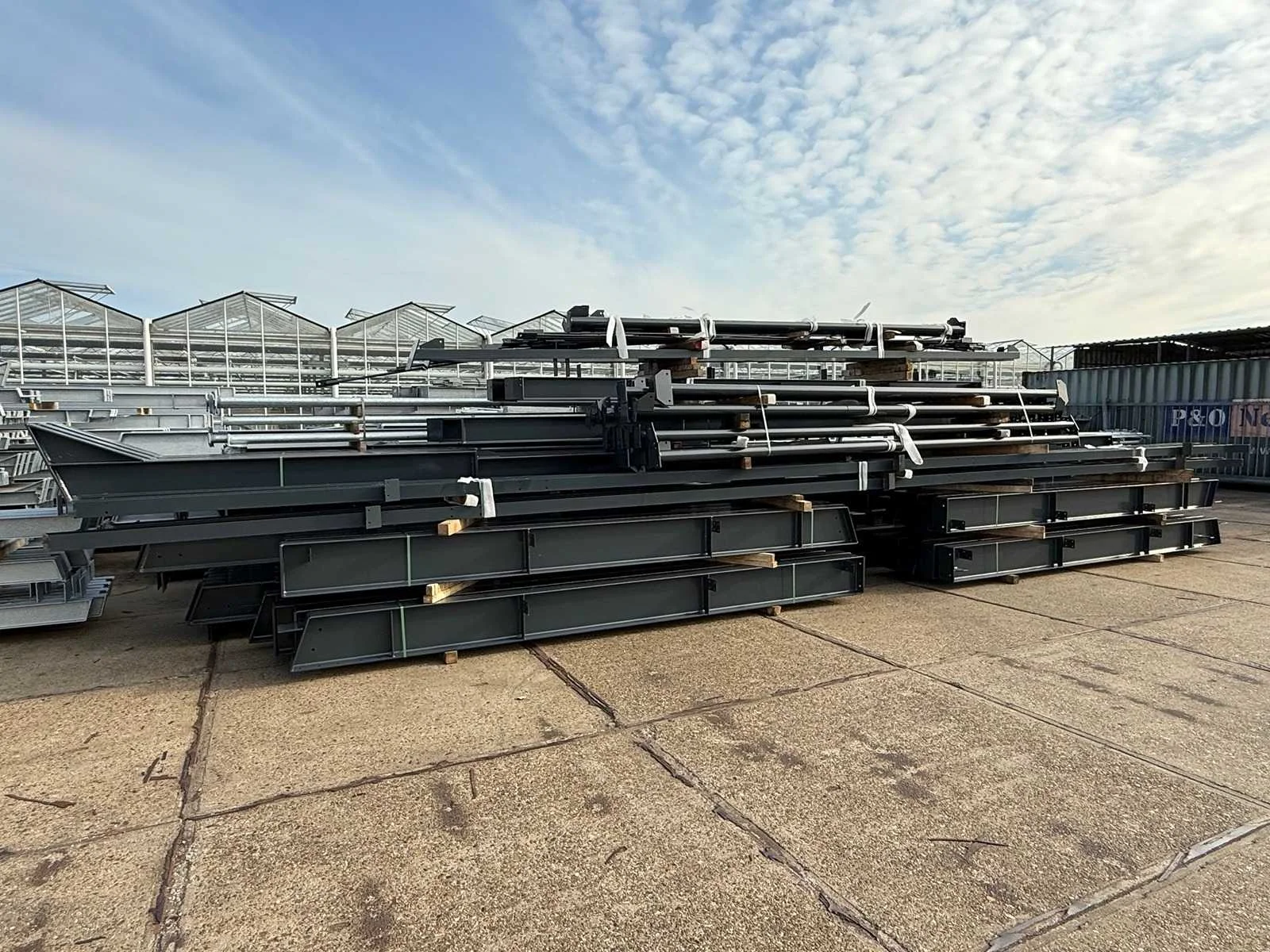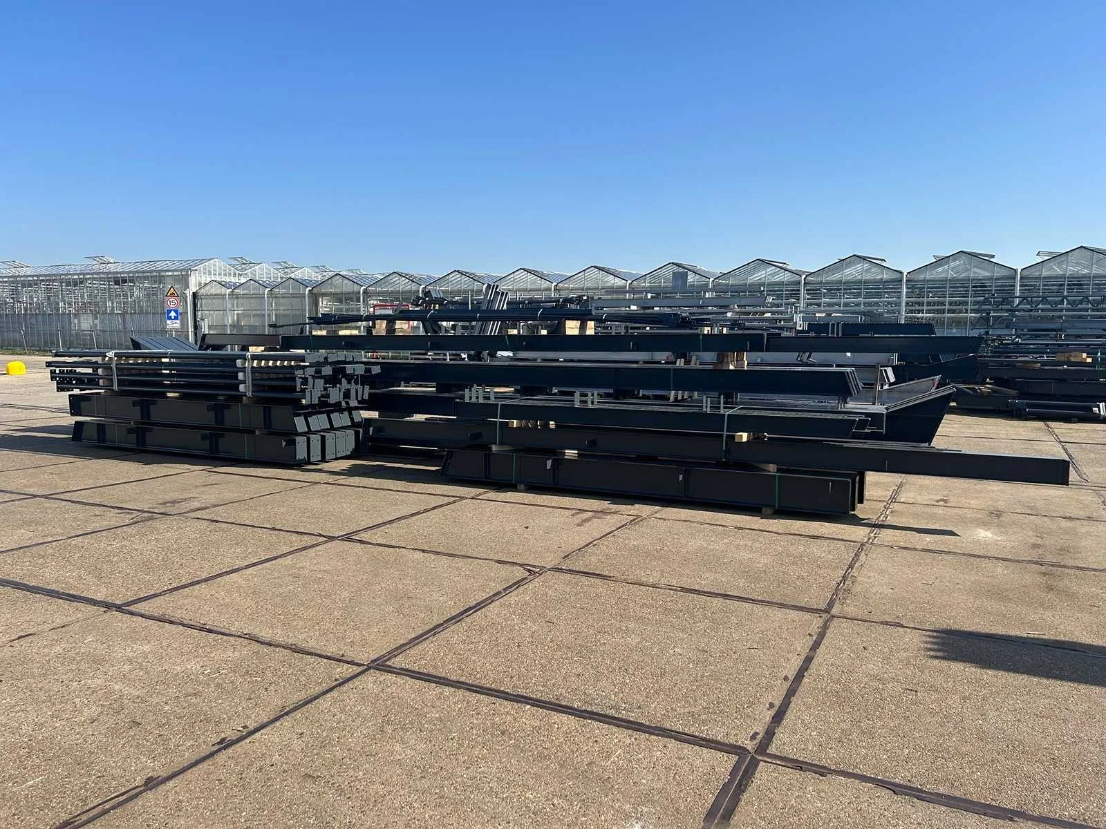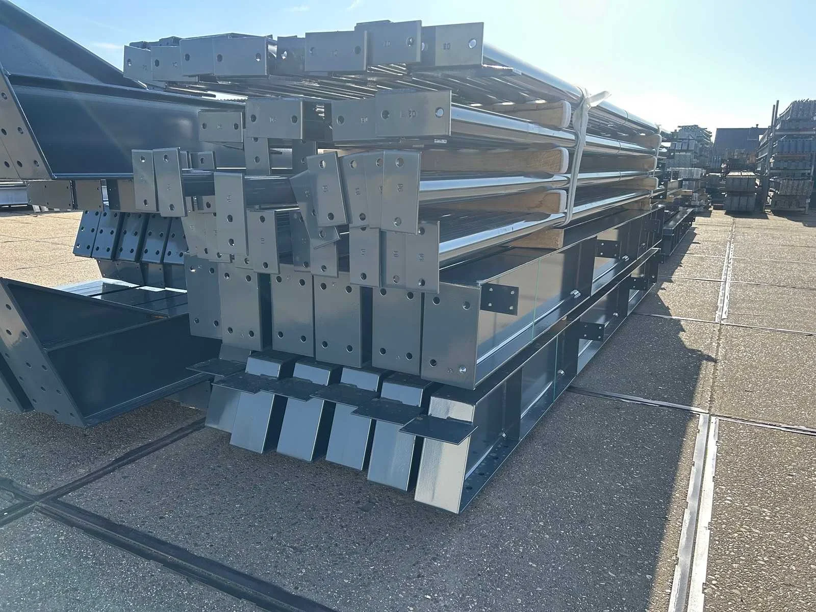Nederlandse productie; vrije overspanning; spanten h.o.h. 5000mm; staalberekeningen; staaltekeningen; montagetekeningen; ankerplan; staal genummerd volgens montageplan; dakhelling 20 graden; 9 sets tussenspanten IPE330/270; 2 sets eindspanten IPE 220/200/180 met windstijlen waarvan 1 set voorzien is van een deursparing UNP220; voorzien van drukkokers; windverbanden; gordinglippen; bouten en moeren; meestort ankers; staalconstructie volgens productnorm EN1090 (Certificaat na aankoop verkrijgbaar); kavel ligt netjes transportklaar en dient met 1 trailer opgehaald te worden; kavel wordt gratis met een heftruck geladen Materiaal: Gepoedercoat staal antraciet Bouwjaar: 2025 Totaal oppervlakte: 1100m² Nok hoogte: 8504mm Goot hoogte: 4500mm Totale afmeting L: 50000mm Totale afmeting Breedte: 22000mm