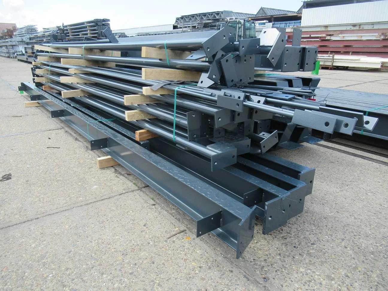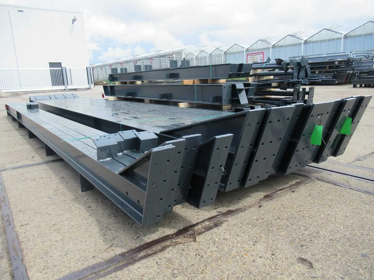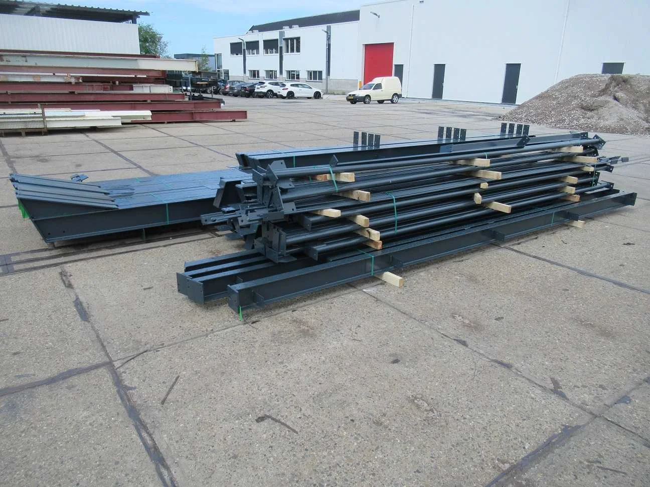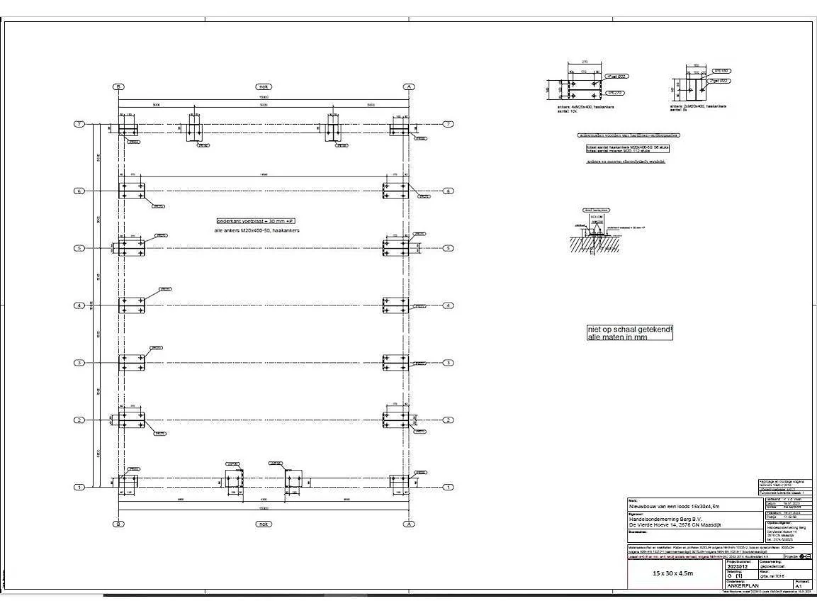Nederlandse productie; vrije overspanning; spanten h.o.h. 5000mm; staalberekeningen; staaltekeningen; montagetekeningen; ankerplan; staal genummerd volgens montageplan; dakhelling 20 graden; 5 sets tussenspanten IPE 270/240; 2 sets eindspanten IPE 200/180 met windstijlen waarvan 1 set voorzien is van een deursparing; voorzien van drukkokers; windverbanden; gordinglippen; bouten en moeren; meestort ankers; staalconstructie volgens productnorm EN1090 (Certificaat na aankoop verkrijgbaar); kavel ligt netjes transportklaar en dient met 1 trailer opgehaald te worden; kavel wordt gratis met een heftruck geladen Materiaal: gepoedercoat staal kleur antraciet Bouwjaar: 2025 Totaal oppervlakte: 450m² Nok hoogte: 7230mm Goot hoogte: 4500mm Totale afmeting L: 30000mm Totale afmeting Breedte: 15000mm