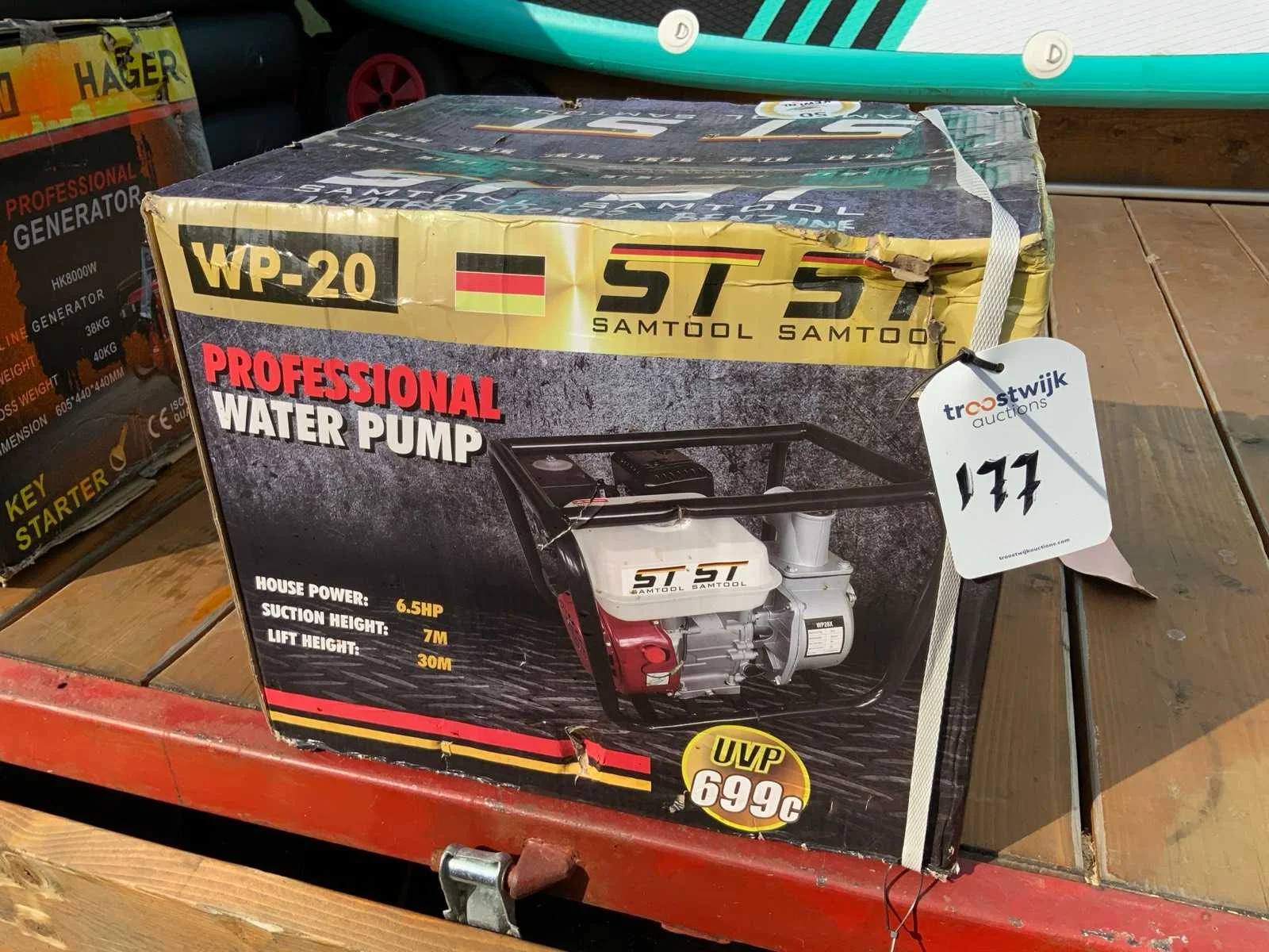 Vermogen: 6,5 HP, hoogte maximaal: 7 meter, brandstof benzine Merk: ST Samtool Model: WP-20