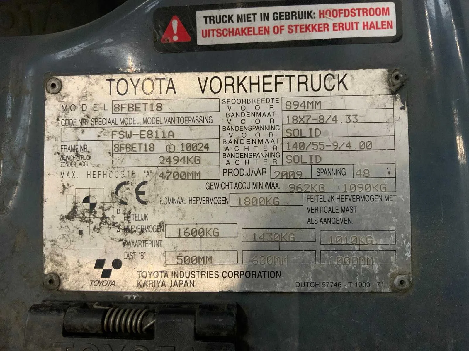 Accu van bouwjaar 2023; 24/6 PzSH 750; 48V; verstelbare lepels; Merk: Toyota Type: 8FBET18 Bouwjaar: 2009 Brandstof: Elektrisch Aantal wielen: 3 Accu lader: true Free-lift: true Side-shift: true Triple mast: true Eigen gewicht: 3532kg Hefvermogen: 1800kg Lepellengte: 1150mm Max. hefhoogte: 4700mm Hefhoogte: 4700mm Vol rubber banden: true Minimale doorrijhoogte: 2150mm Totale afmeting L: 3200mm Totale afmeting Breedte: 1070mm Totale afmeting Hoogte: 2150mm