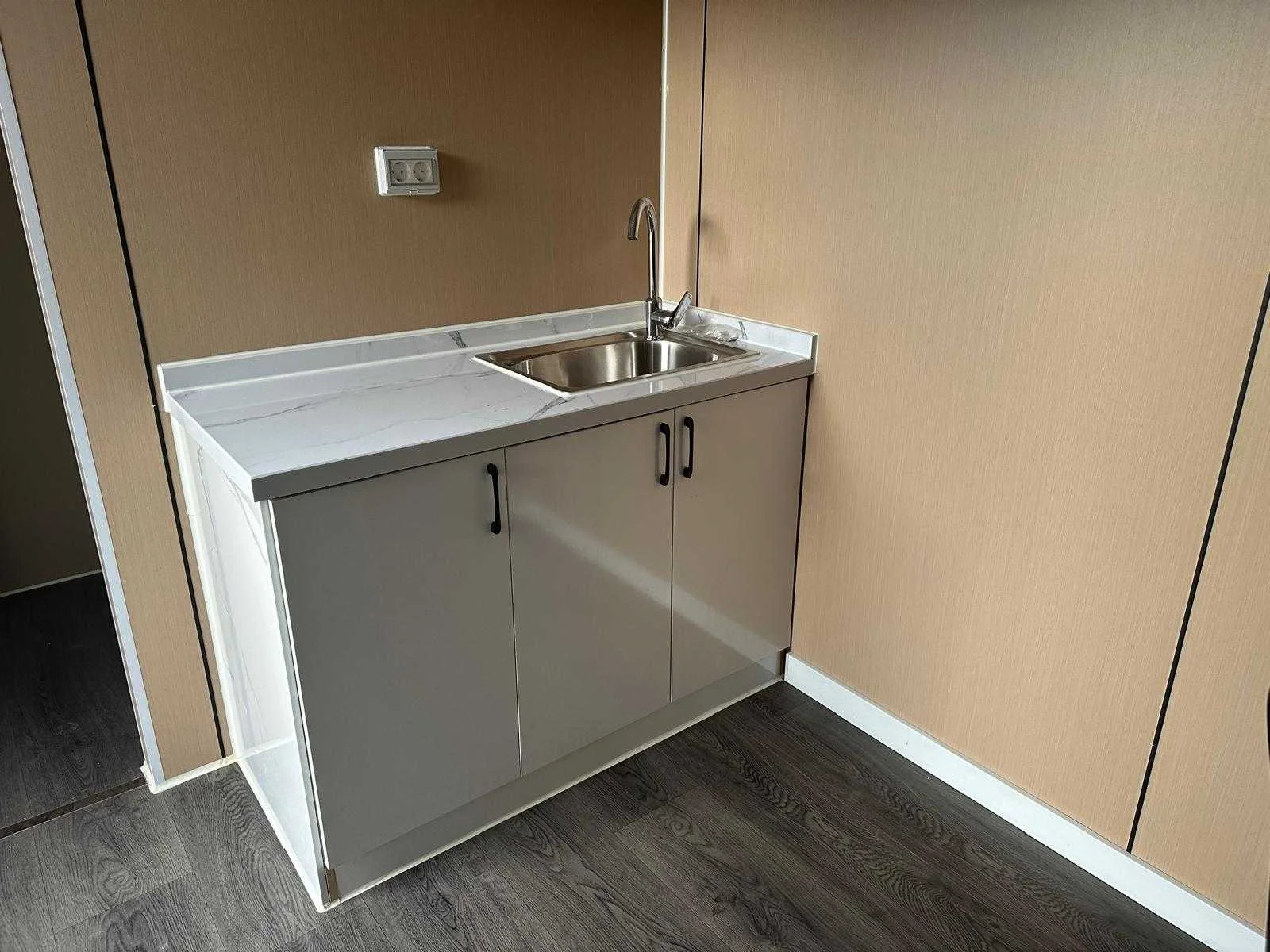 Voorzien van 1 woning; 1 badkamer; 1 toilet; 1 keuken blok; riool, water en stroom aansluiting allemaal voorbereid dus makkelijk aan te sluiten; meterkast; deur stopper; lepel gaten; gebruikt; Koper dient deze zelf op te laden met een kraanwagen; zonder kantine tafel en stoelen; Bouwjaar: 03-2024 Eigen gewicht: 3780kg