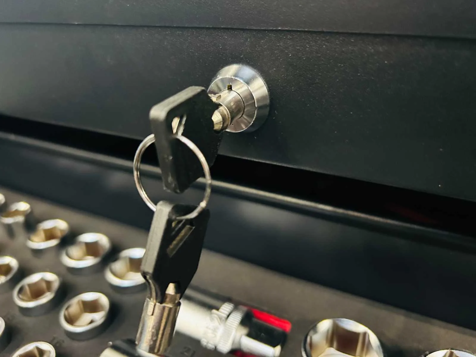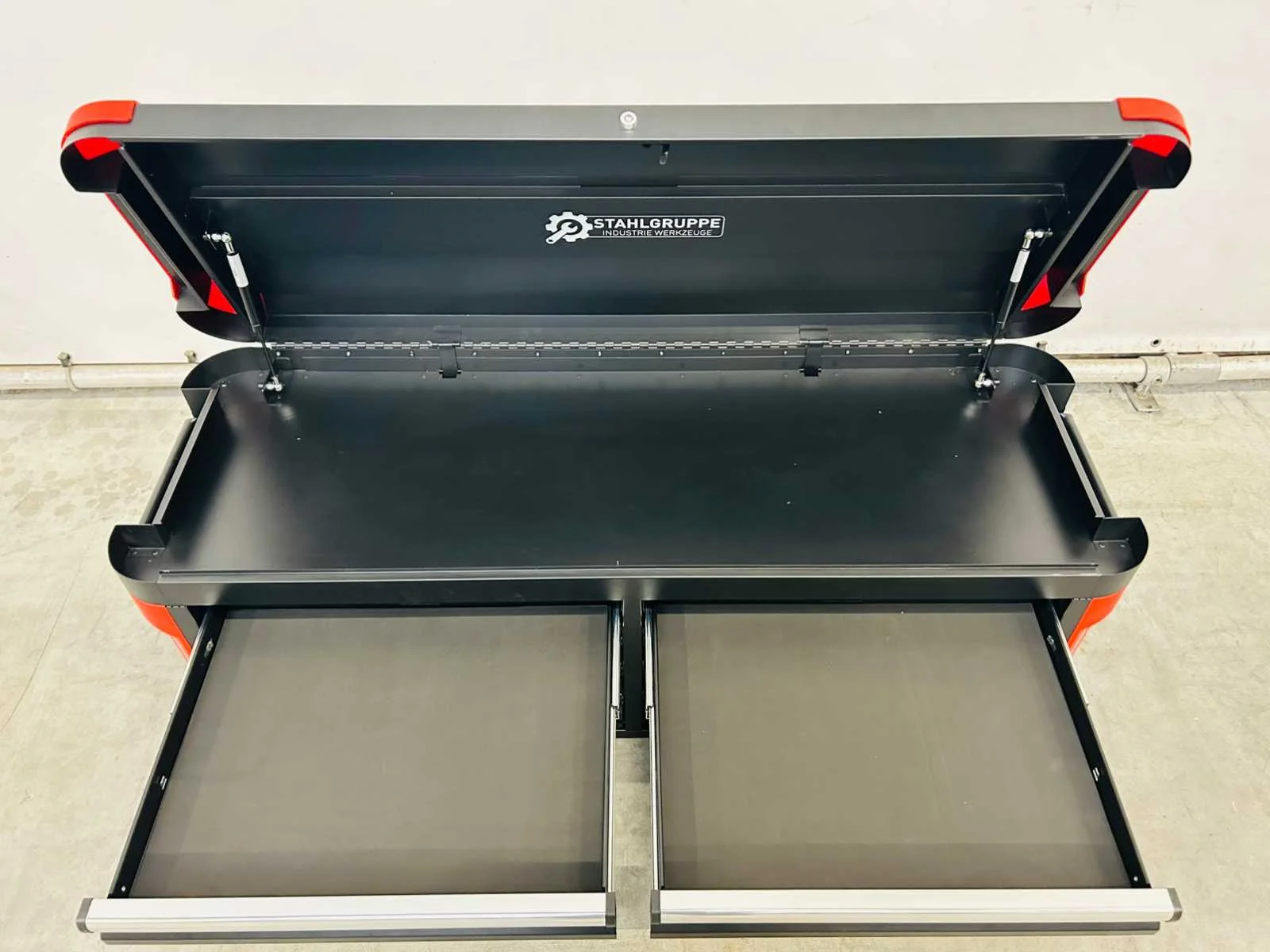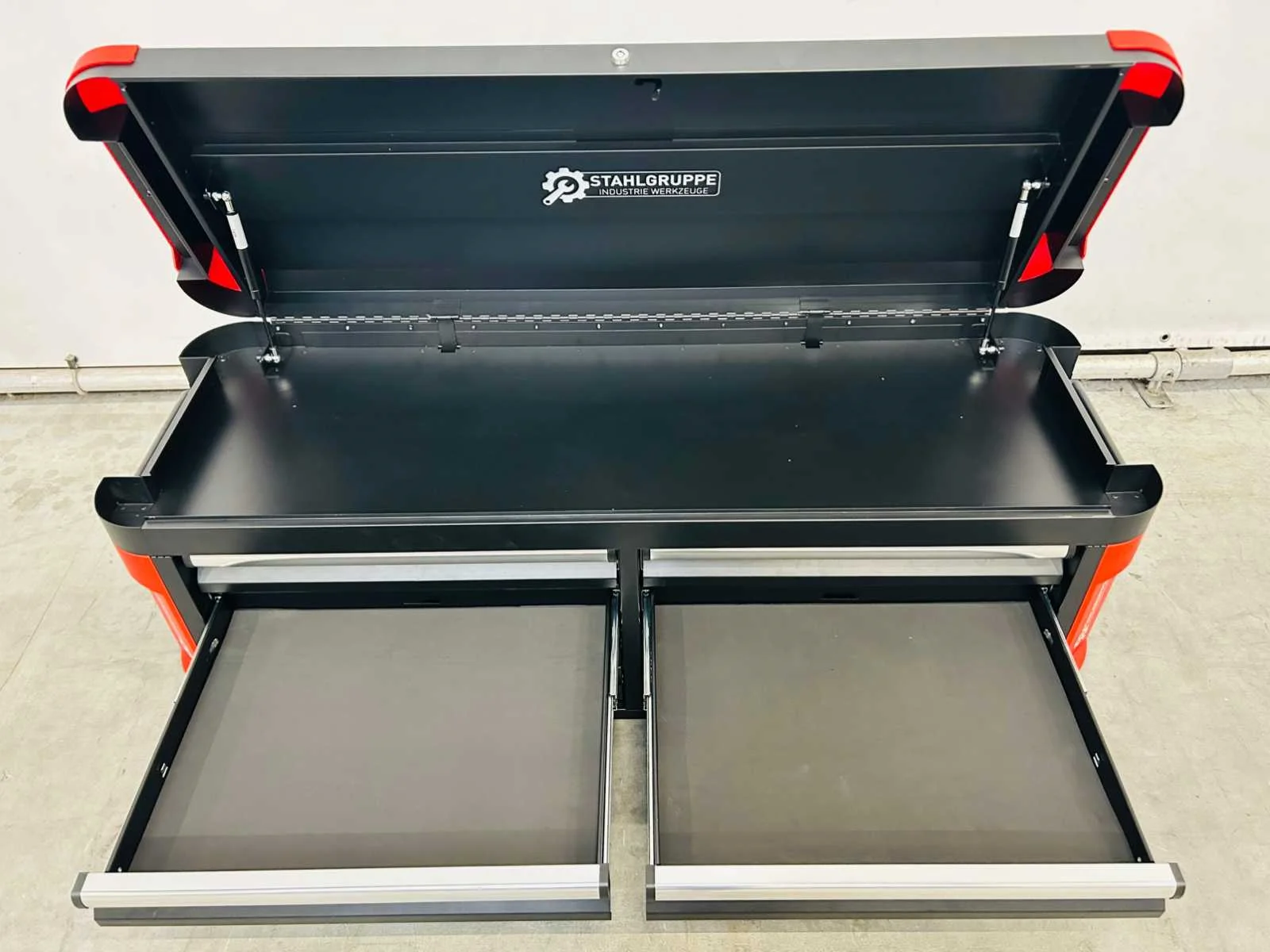 Kar met afneembare topbox; topbox met 8 laden en boven klep; Kar met 5 laden en kast met dubbele openslaande deuren; 13laden - 9 gevuld; 2 zwenkwielen waarvan 2 geremd; 7212 Merk: Stahlgruppe Model: SG2024 Type: 327-delige Kleur: rood - zwart Gewicht: 215kg Lengte: 144cm Breedte: 54cm Hoogte: 154cm