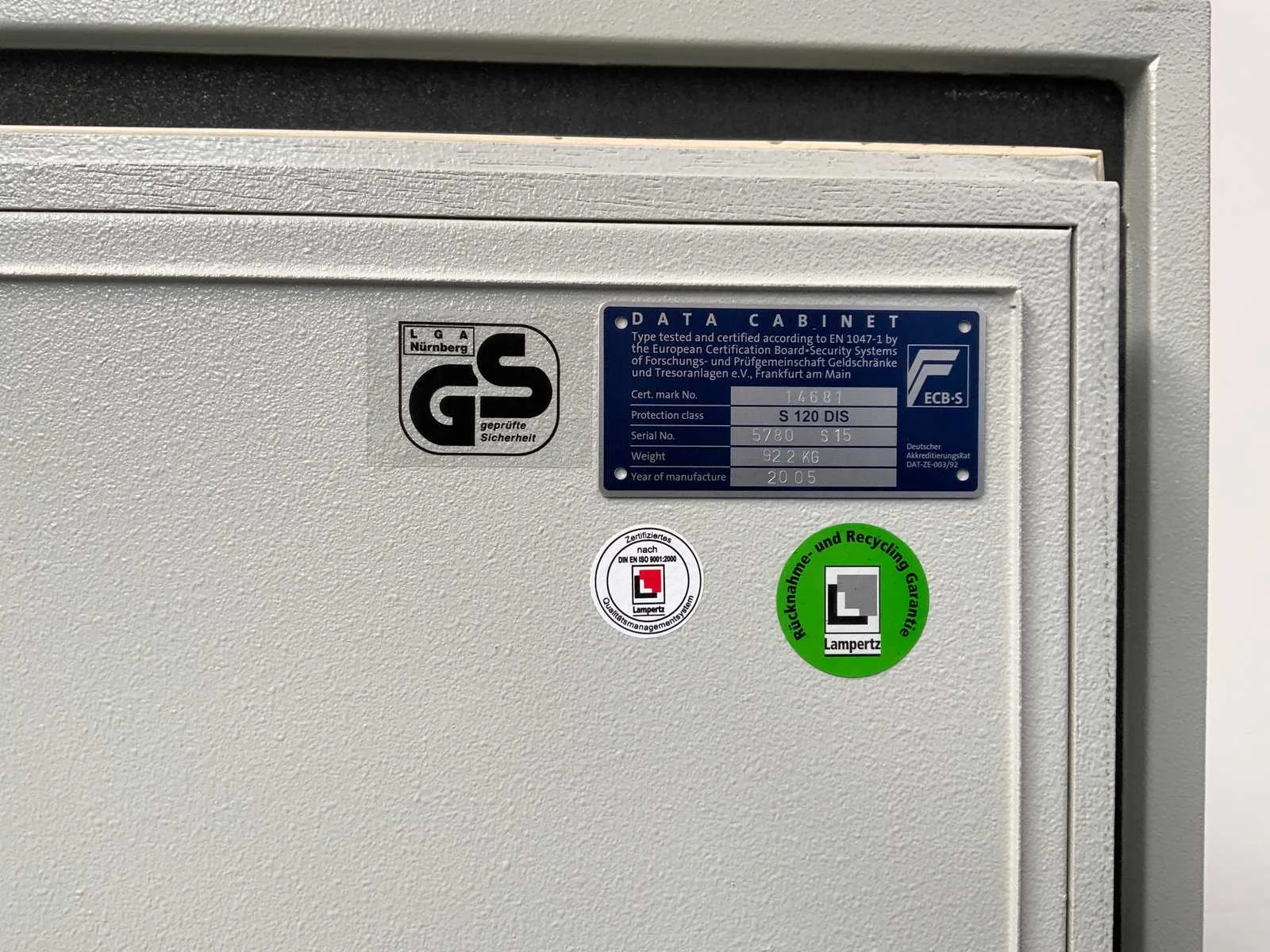 Inhoud van de kluis kan afwijken; meer of minder lades; Binnenafmeting; 850 x 470 x 1450 mm; Deuropening 180 graden; ECB-S gecertificeerde brandwerendheid; S120DIS; bescherming tegen inbraak en brand; v.v. sleutel; v.v. legbord; Merk: Datasafe Model: Lampertz S15 Gewicht: 922kg Lengte: 83cm Breedte: 116cm Hoogte: 185cm