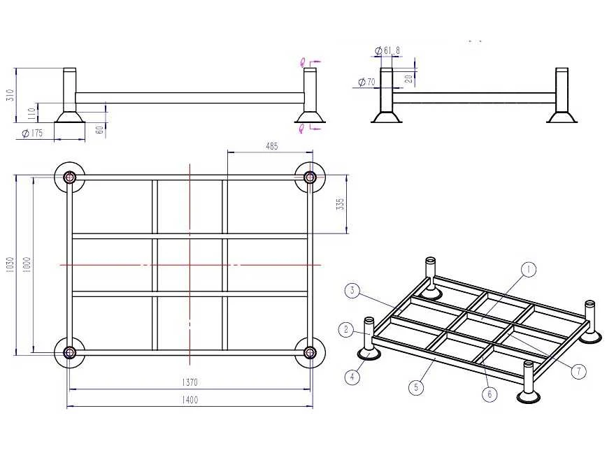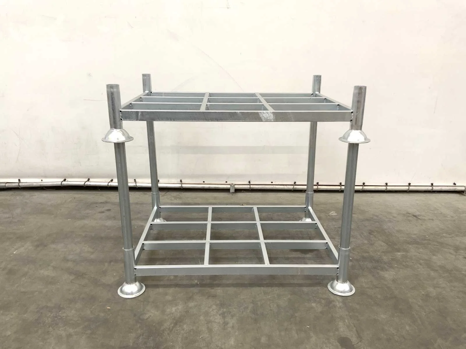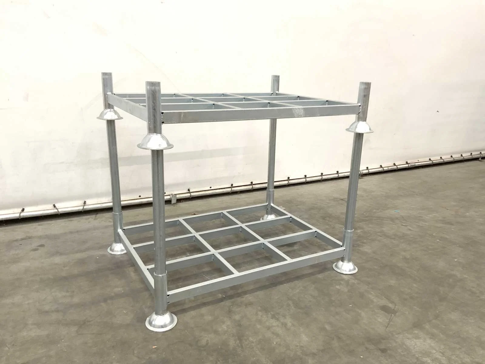 Ongebruikt; open rasterframe; thermisch verzinkt Hart op hart maat 1370x1000mm; geschikt voor 1 blokpallet of 1 europallet; geschikt voor rongen 60.3 mm; v.v. 4 stalen rongen van Ø60x3.0x1000mm per stapeljuk; 7562 Afmeting l: 1030mm Afmeting b: 1400mm Staal: true