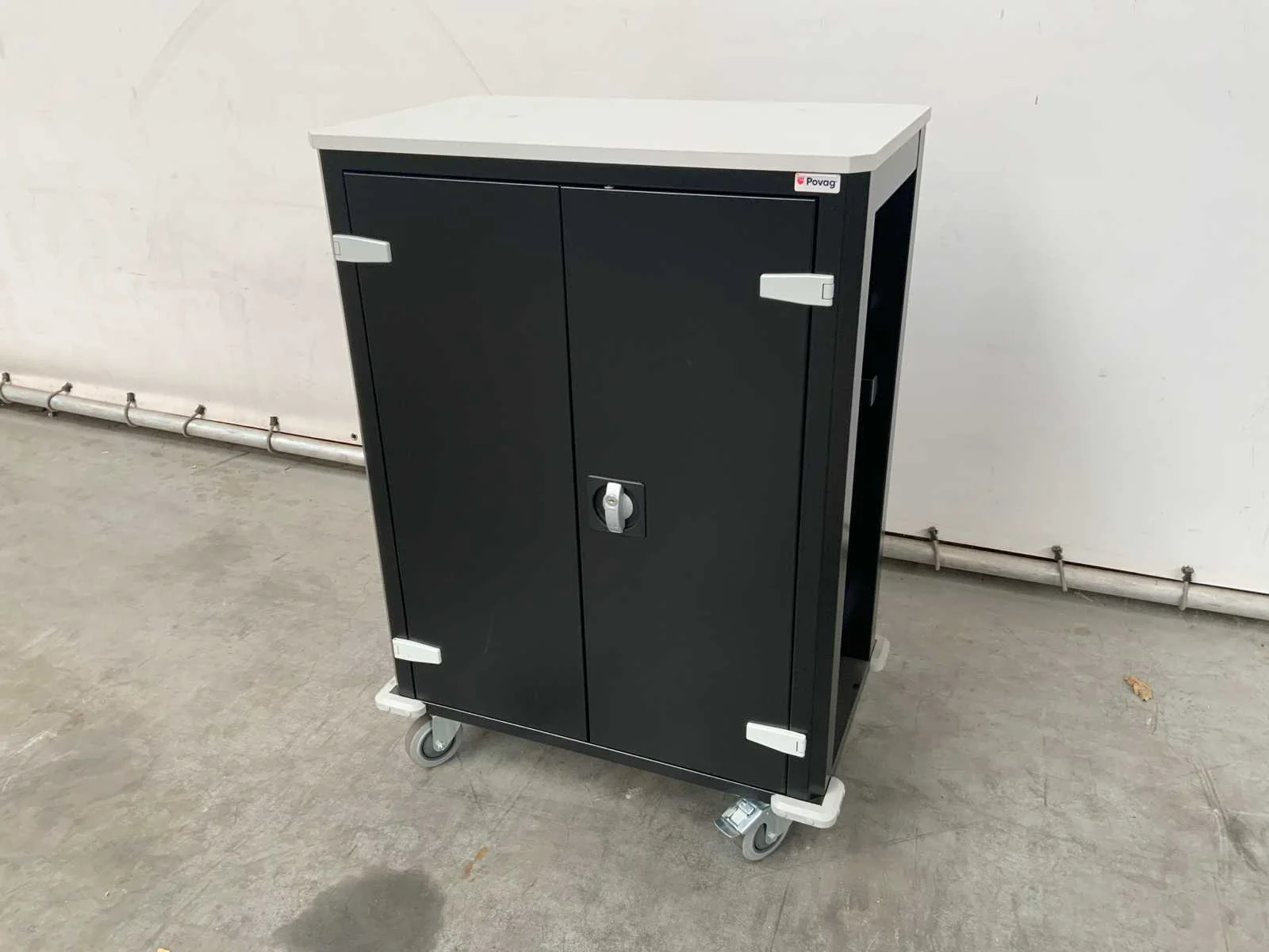 Opberg/oplaadstation voor tablets en laptops, Voorzien van zwenkwielen, 230v aansluiting, 32 vakken, betreft een ongebruikt product Merk: Povag