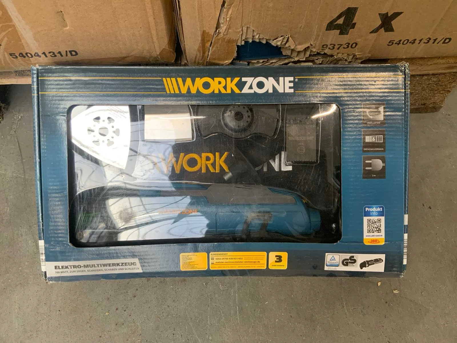 Op 1 pallet; Merk: WorkZone Type: 93730 Spanning: 120V Met koffer: true Met opzetstukken: true