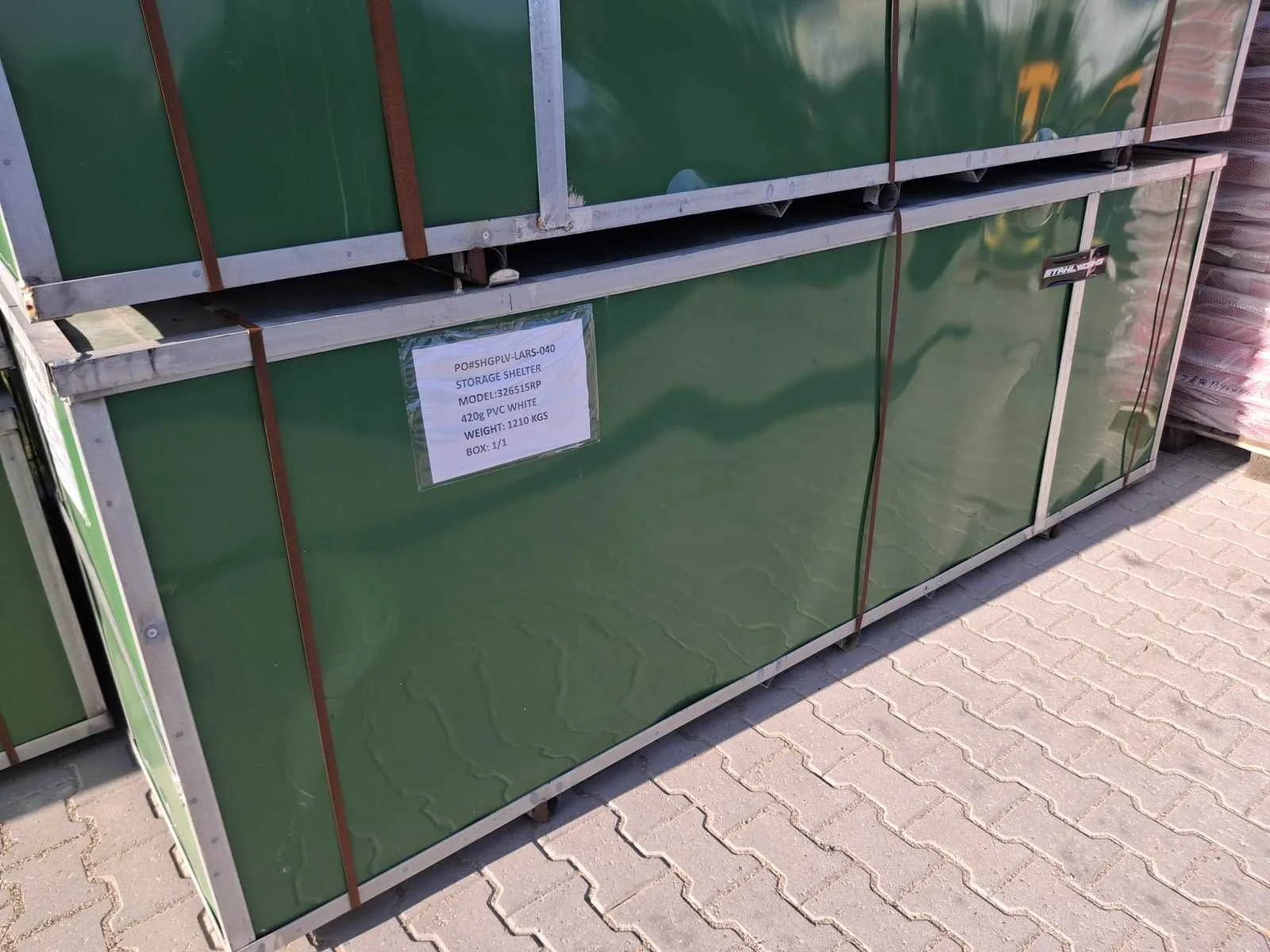 Voorzien van opslagtent / shelter; singel trussen-/buizensysteem; gegalvaniseerd; ruimte tussen bogen 200 cm; materiaal 420 gram PVC cover; kleur wit; inclusief montage handleiding; ongebruikt in metalen kist Merk: Stahlworks Type: 20x9,76x4,58 meter Bouwjaar: 2024 Totale afmeting L: 20000mm Totale afmeting Breedte: 9760mm Totale afmeting Hoogte: 4580mm