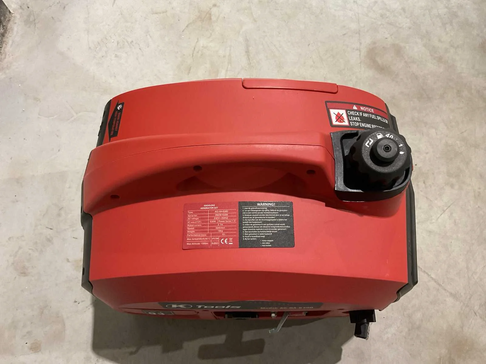 Voorzien van 1 cilinder 2-takt Benzine motor; Motorvermogen: 1,1 kW (1,5 pk); Mengverhouding: 1:25; Brandstof consumptie 1 l/h; Geluidsniveau 65 dB; Inhoud: 4,1 liter; Product gewicht 19 kg; Productafmeting: 400x300x300 mm (bxhxl); Vermogen 700 W; Voltage 220 V; Piekvermogen: 650 watt; Nominaal vermogen: 550 watt; Aantal stopcontacten: 1; Luchtgekoelde generator; Ongebruikt in doos (Afmeting transport verpakking 505x360x440 mm lxbxh, gewicht 19 kg) Merk: K Tools Type: AG-HA-6300 Bouwjaar: 2025 Aantal cilinders: 1 Motorvermogen (kW): 1.1kW Luchtgekoeld: true Mobiel: true Machinegewicht: 19kg Totale afmeting L: 505mm Totale afmeting Breedte: 360mm Totale afmeting Hoogte: 440mm