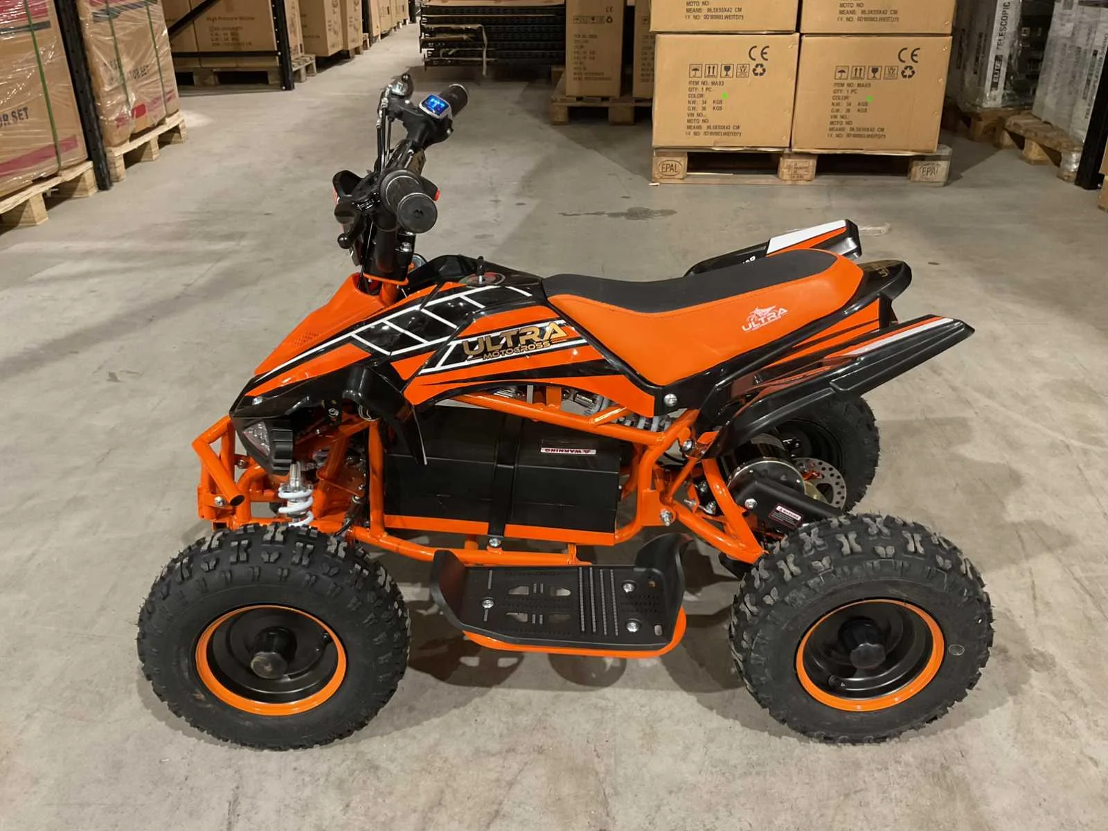 Voorzien van 1000W 36V elektrische motor; ouderen sleutel 3 verschillende snelheden; achterwielaandrijving; bandenmaat 6” inch; 2 sleutels; ongebruikt in doos (transport afmetingen 100x55x45 cm 48kg) Merk: Ultra Motocross Model: MA03E Product type: ATX 1000 OR Gewicht: 45kg Aantal sleutels: 2 Transmissie: Automaat Bouwjaar: 2025 Vermogen (kW): 1kW Brandstof: Elektrisch Kleur: Oranje Lengte: 100cm Breedte: 55cm Hoogte: 45cm