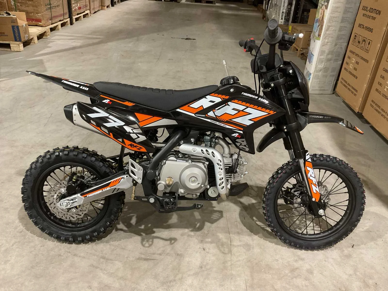 Voorzien van 110 cc motor; 4 takt; kick start; bandenmaat voor 14” inch achter 12” inch; hydraulische vering voor en achter; schijfremmen; verlichting; ongebruikt in doos (transport afmetingen 130x40x70 cm) Merk: Ultra Motocross Type: Thunder 110 OR Brandstof: Benzine 4 Takt Cilinderinhoud: 110cc Gewicht: 83kg Kleur: Oranje Transmissie: Automaat Aantal sleutels: 2