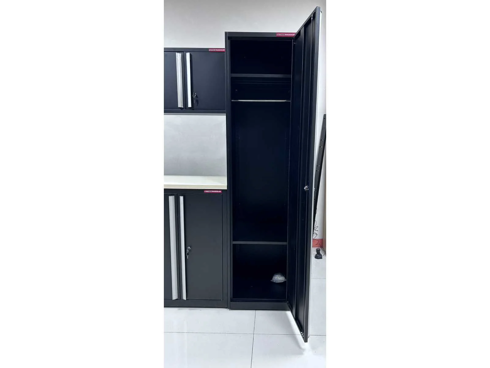 Voorzien van poeder coating; 30 mm houten werkblad; kleur zwart; ongebruikt in dozen (transport afmeting 1,75 m3) Merk: Stahlworks Model: TC-263 Product type: 400x55x203 cm Materiaal: SPCC steel