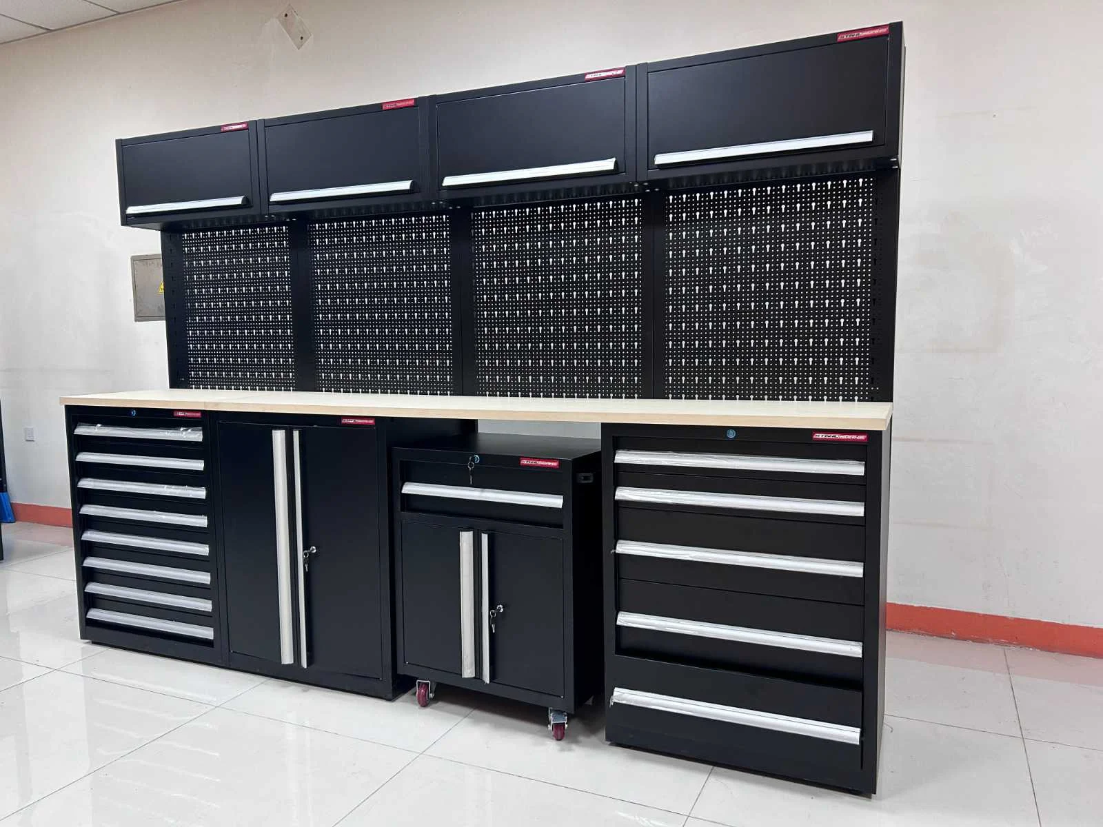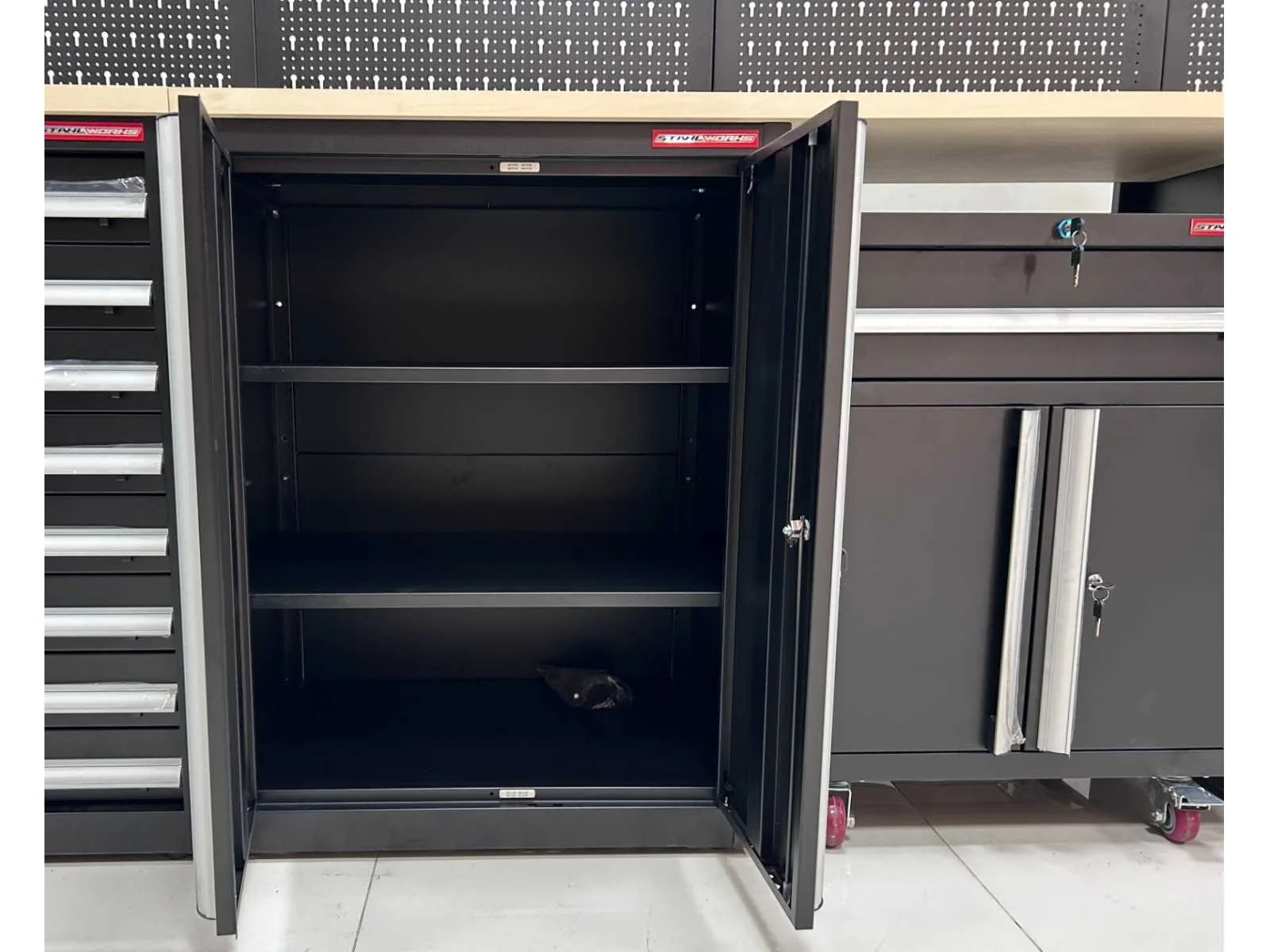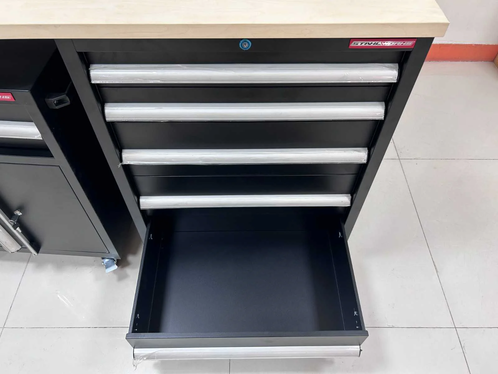 Voorzien van poeder coating; 30 mm houten werkblad; kleur zwart; ongebruikt in dozen (transport afmeting 1,75 m3) Merk: Stahlworks Model: OS-26 Product type: 300x55x203 cm Materiaal: SPCC steel