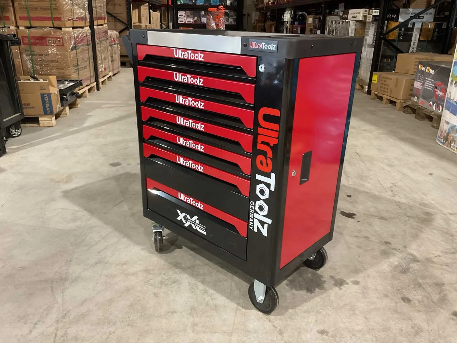 Voorzien van 7 lades waarvan 7 gevuld met gereedschap; professioneel chroom-vanadium gereedschap; heavy duty gereedschapswagen; stevig werkblad; 4 wielen; stevig handvat; ongebruikt in doos (transport afmetingen 80x50x85 cm) Merk: UltraToolz Type: Germany 7/7 Bouwjaar: 2025 Aantal laden: 7 Eigen gewicht: 76kg Totale afmeting L: 800mm Totale afmeting Breedte: 500mm Totale afmeting Hoogte: 850mm