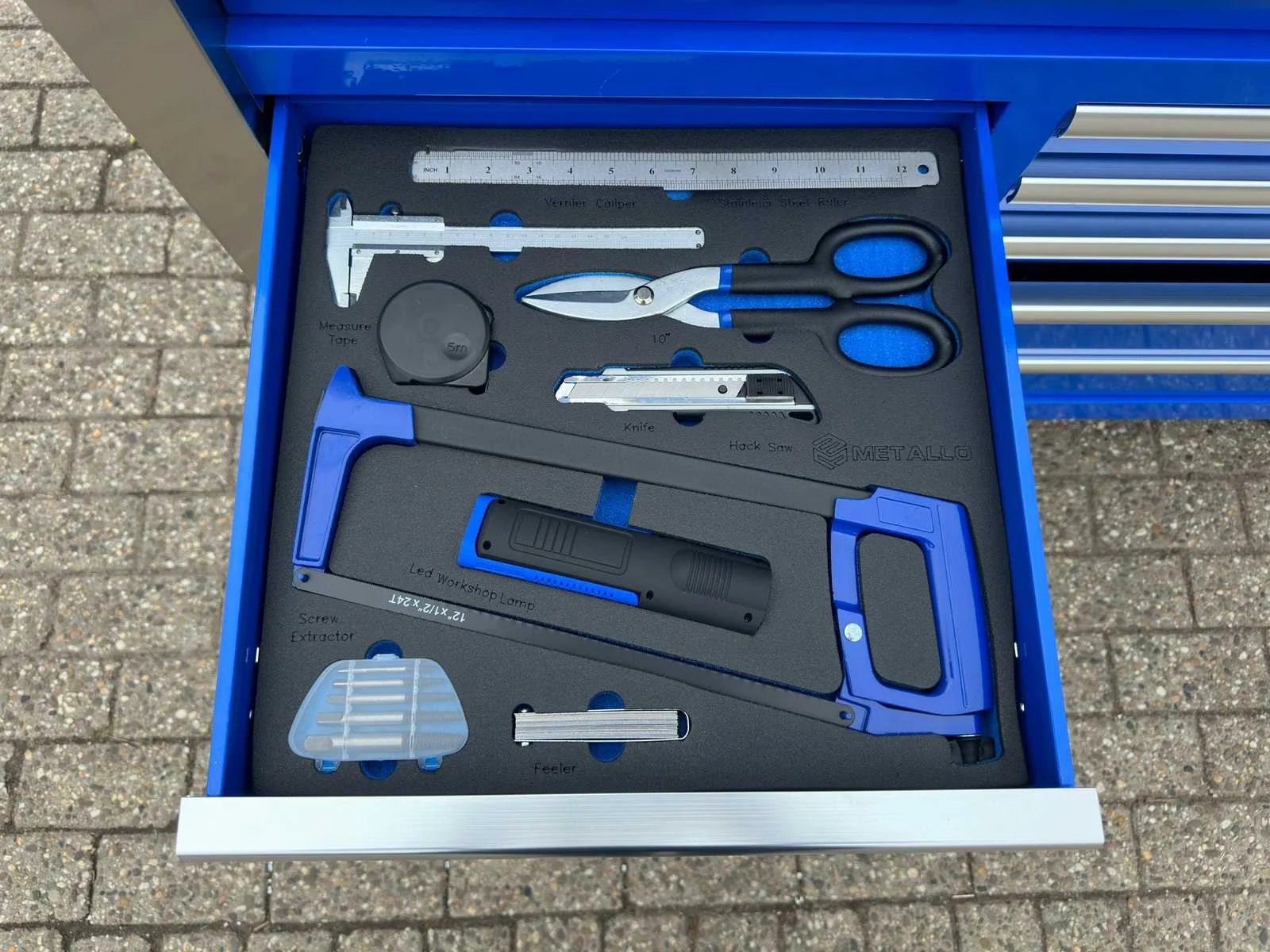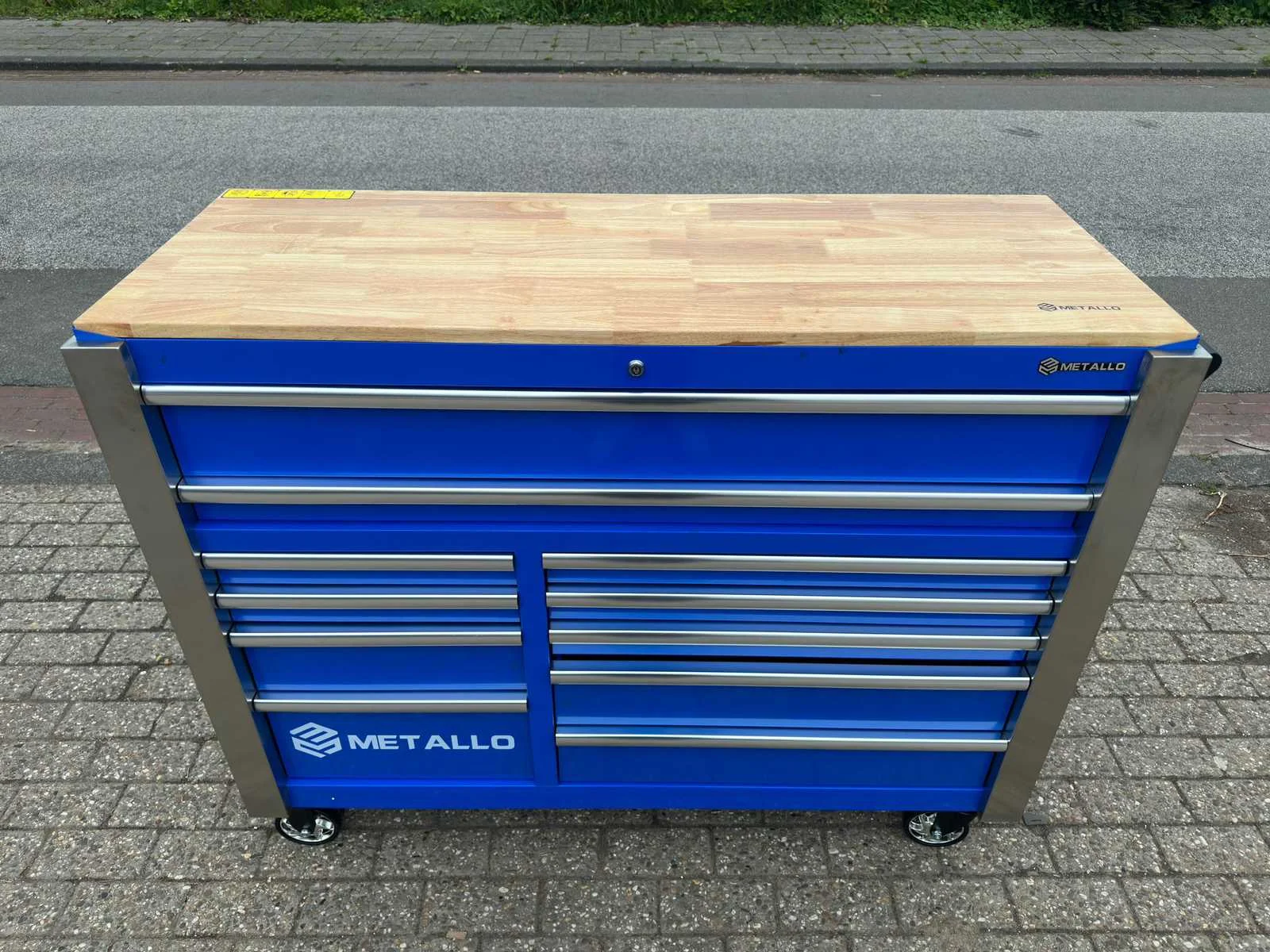 Voorzien van 11 lades waarvan 9 gevuld; Chrome vanadium; Houten werkblad; 4 wielen waarvan 2 zwenkwielen; Handvat; Ongebruikt in doos Merk: Metallo Type: Jumbo Kleur: grijs Lengte: 146cm Breedte: 55cm Hoogte: 110cm