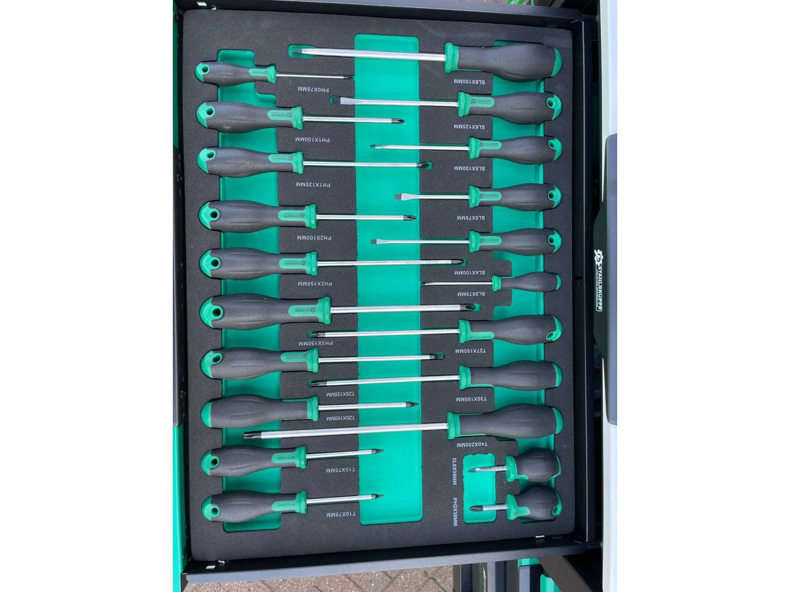 Voorzien van 11 gevulde laden; Gereedschap: chrome vanadium; Inhoud: 2 dopsleutel sets, momentsleutel, ringsteeksleutel set 6-32, ringratelsleutel 8-19, inbussleutel set, ringsleutel set 6-32, torx sleutel set T8-T70, schroevendraaier set (21 stuks), tangen set (9 stuks), beitel en doorslagen set (18 stuks), vijlen set (5 stuks), T-greep dopsleutel set 6-14, T-greep torx sleuel set T15-T45, hamers (3 stuks), VDE gereedschap (3 tangen en 7 schroevendraaiers), kabelschoentang set, enzovoort; Ongebruikt in doos Merk: Stahlgruppe Type: Jumbo GR Bouwjaar: 2024 Aantal laden: 13 Met inhoud: true Eigen gewicht: 138kg Totale afmeting L: 1100mm Totale afmeting Breedte: 620mm Totale afmeting Hoogte: 1120mm