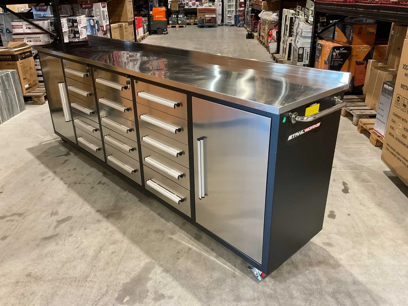 RVS werkbank met 15 lades en 2 deurkasten; 5cm opstaande rand. Merk: Stahlworks Model: RVS Product type: 10-15 0/C Breedte: 30000mm Lengte: 600mm Hoogte: 1075mm Materiaal: RVS