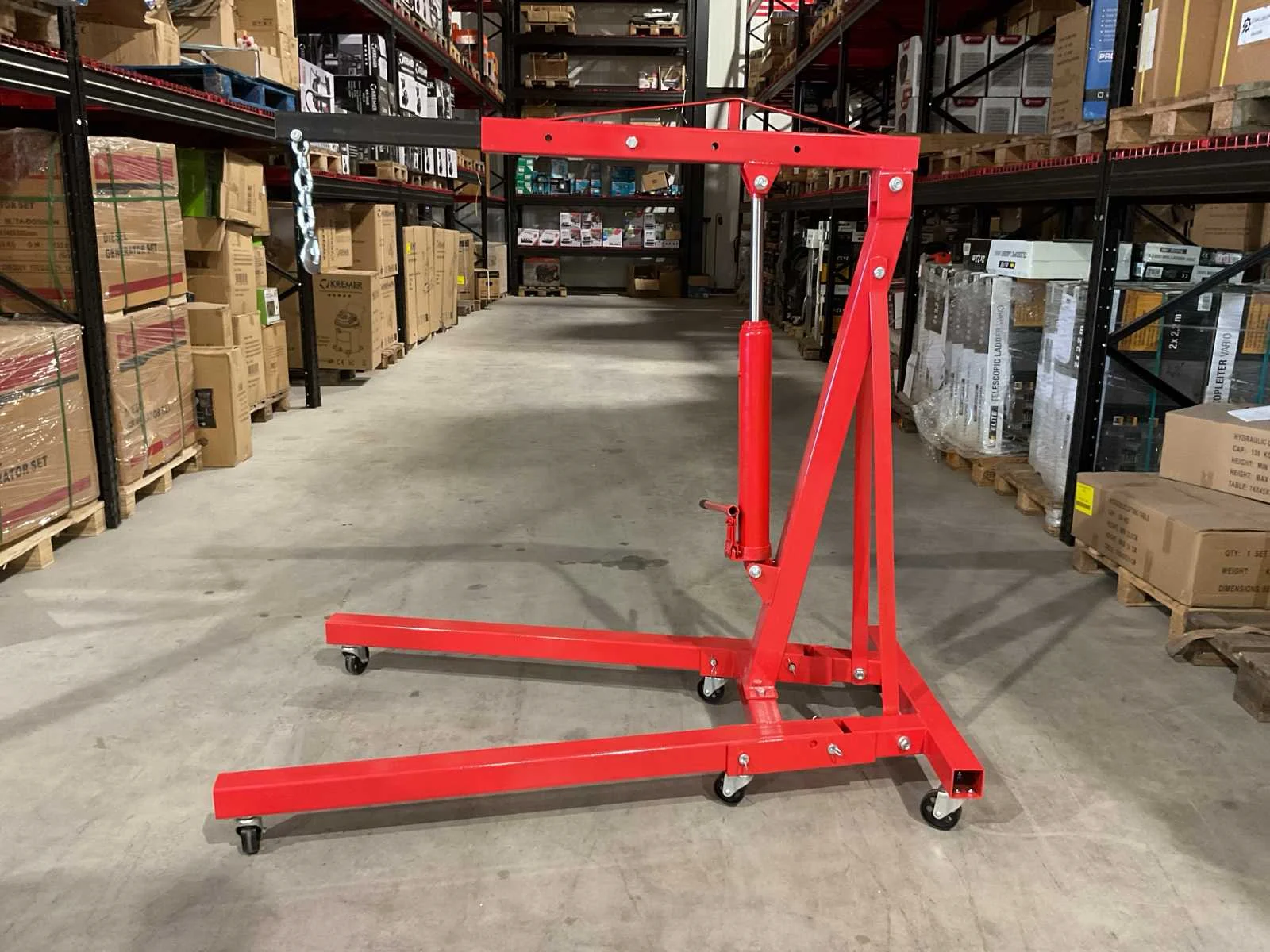 Voorzien van zwenk wielen; telescoop arm; 4 verschillende standen (500, 1000, 1500 en 2000 kilo); lengte van 107 tot 160 cm; Maximale reikhoogte van 270 cm; Binnenbreedte tussen de wielen: 88 cm en de hoogte van de wielen bedraagt 12 cm; Ongebruikt in doos (Afmeting transport verpakking doos 1 - 1385x310x155 mm / Doos 2 - 830x580x80 lxbxh, gewicht 75 kg) Merk: Benson Tools Type: 2 Ton Bouwjaar: 2025 Eigen gewicht: 75kg Totale afmeting Hoogte: 2700mm