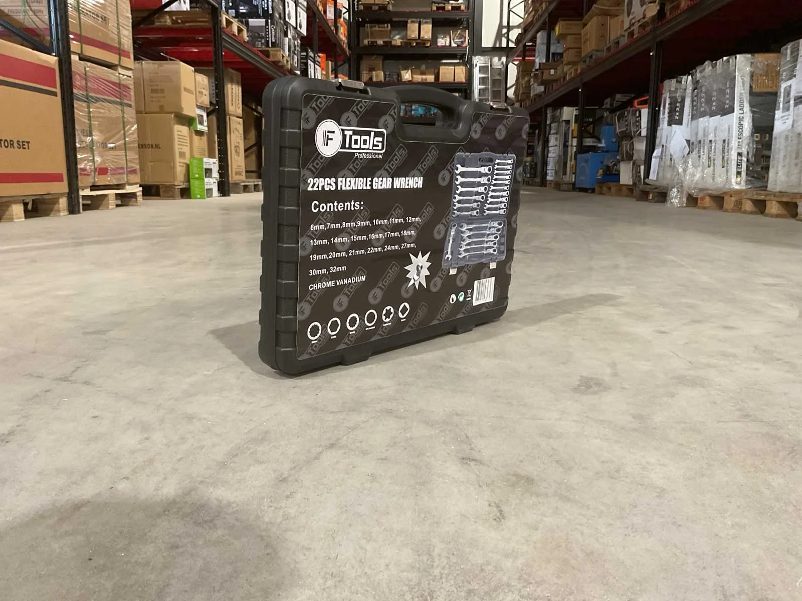 Voorzien van Steek/Ratelringsleutel maten: 6, 7, 8, 9, 10, 11, 12, 13, 14, 15, 16, 17, 18, 19, 20, 21, 22, 23, 24, 27, 30, 32mm; Kunstof koffer; Ongebruikt (Transport Afmeting 500 x 70 x 360mm, Gewicht: 8,84 kg) Merk: F Tools Professional Set: true Delig: 22 Bouwjaar: 2025 Type: 22PCS Flexible Gear Wrench