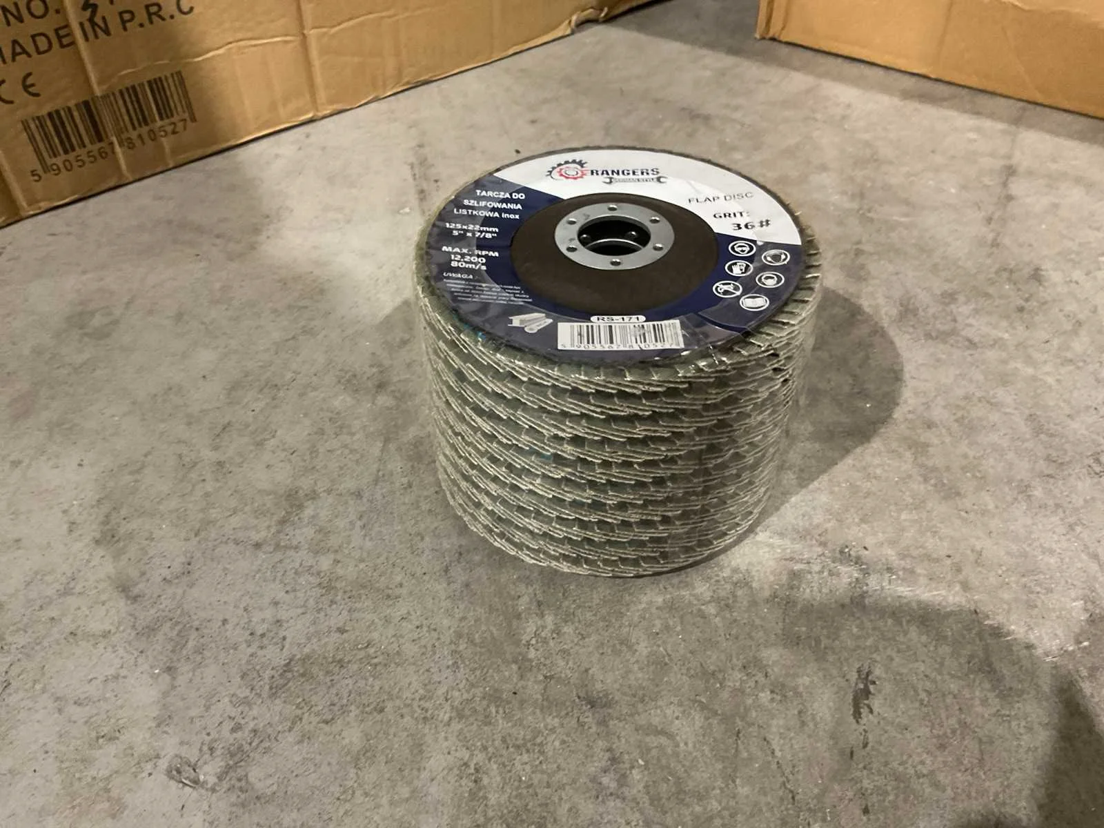 Voorzien van 1 doos met 2 dozen met elk 10 verpakkingen van 10 stuks; ongebruikt in doos Merk: Rangers Model: Grit 36 Type: RS-171 Schijfdiameter: 125mm Gewicht: 15kg Lengte: 70cm Breedte: 30cm Hoogte: 25cm