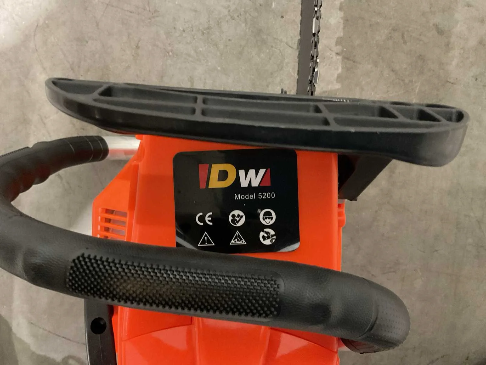 Voorzien van Stationair toerental: 3000rpm; Max. snijsnelheid: 10.000rpm; Inhoud brandstoftank: 580 ml; Krachtige motor: 52 cc; Zaaglengte: 52 cm; Brandstof: 1:35 (loodvrije benzine 35: twee-takt olie 1); Ketting dikte: 0.058 "/ 1,47 mm; Kettingsteek: 0,325 "/ 8,25 mm; Olietank: 250 ml; Trillingen: 8,5 m / s ², K = 1,5 m / s²; Geluidsdrukniveau: EN ISO 22868: 101 db (A) K = 3,0 dB (A); Geluidsniveau: EN ISO 22868: 2003: 114 db (A); beschermhoes; kettingpijlen; bougiesleutel; schroevendraaier; 2 Allen sleutels Merk: DW Type: DW-5200 Bouwjaar: 2025 Eigen gewicht: 6.5kg Totale afmeting L: 91mm Totale afmeting Breedte: 26.5mm Totale afmeting Hoogte: 28.5mm