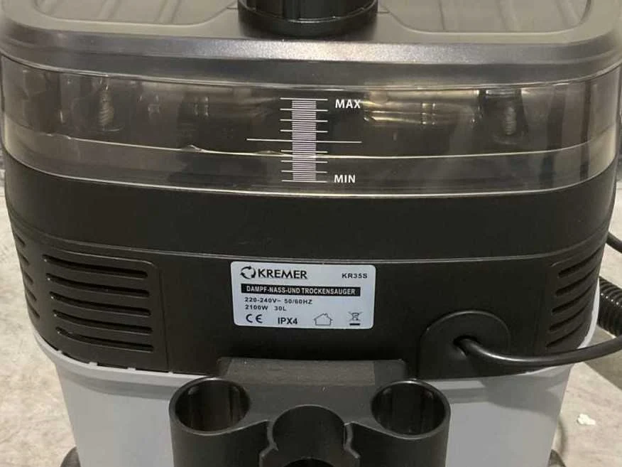 Voorzien van nat en droog functie; bescherming tegen oververhitting; Nat- en droog stofzuiger; Stoom functie; Sproei functie; Inhoud 30 Liter; Kunststof Ketel; 2100W; 2 Zwenkwielen; 2 Starre wielen spray en zuig functie; Ongebruikt in doos (Afmeting transport verpakking 615x435x545 mm lxbxh, gewicht 13.8 kg) Merk: Kremer Type: KR35S Bouwjaar: 2025 Capaciteit.: 30l/hr Mobiel: true Vermogen: 2100kW Aansluiting: 220V Eigen gewicht: 13.8kg Totale afmeting L: 615mm Totale afmeting Breedte: 435mm Totale afmeting Hoogte: 545mm
