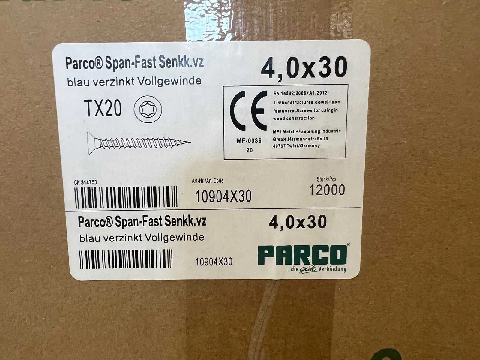 (12000X) PARCO® Spaanplaatschroeven 4,0 x 30 mm Span-Fast blauw verzinkt - TX20. (6000X) PARCO® Spaanplaatschroeven 4,0 x 40mm Span-Fast blauw verzinkt - TX20 (4800X) PARCO® Spaanplaatschroeven 4,0 x 50mm Span-Fast blauw verzinkt deeldraad - TX20 (2400X) PARCO® Spaanplaatschroeven 4,0 x 60 Span-Fast blauw verzinkt deeldraad - TX20 (2400X) PARCO® Spaanplaatschroeven 4,0 x 70mm Span-Fast blauw verzinkt deeldraad - TX20 (1200X) PARCO® Spaanplaatschroeven 5,0 x 80 Span-Fast blauw verzinkt deeldraad - TX25 (1200X) PARCO® Spaanplaatschroeven 5,0 x 90 Span-Fast blauw verzinkt deeldraad - TX25 (1200X) PARCO® Spaanplaatschroeven 5,0 x 100 Span-Fast blauw verzinkt deeldraad - TX25 (1200X) PARCO® Spaanplaatschroeven 6,0 x 120 Span-Fast blauw verzinkt deeldraad - TX30 Within 14 days