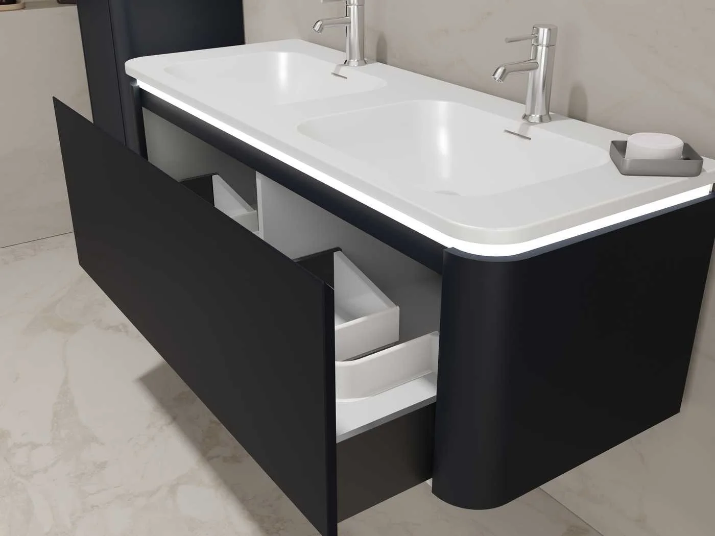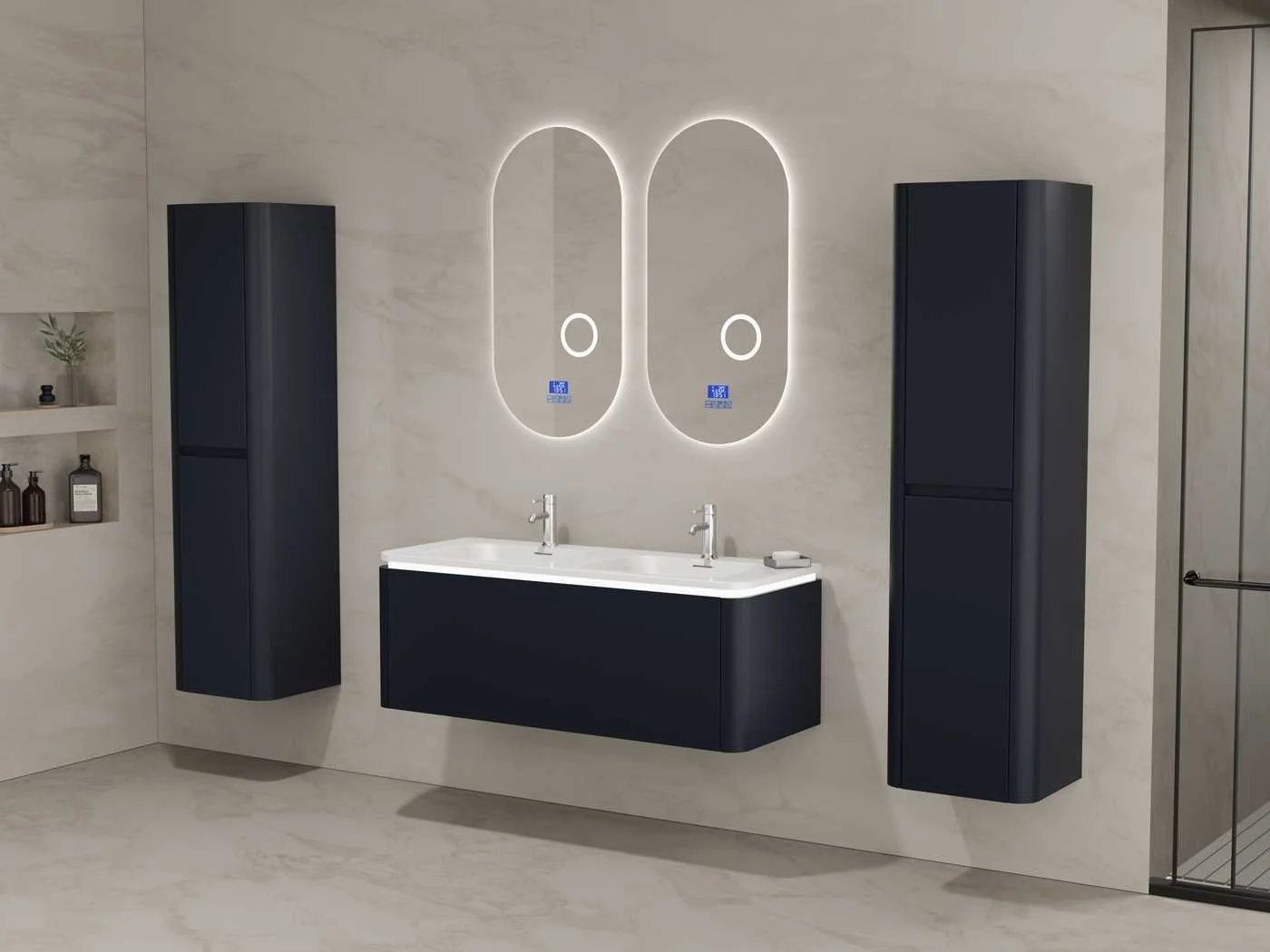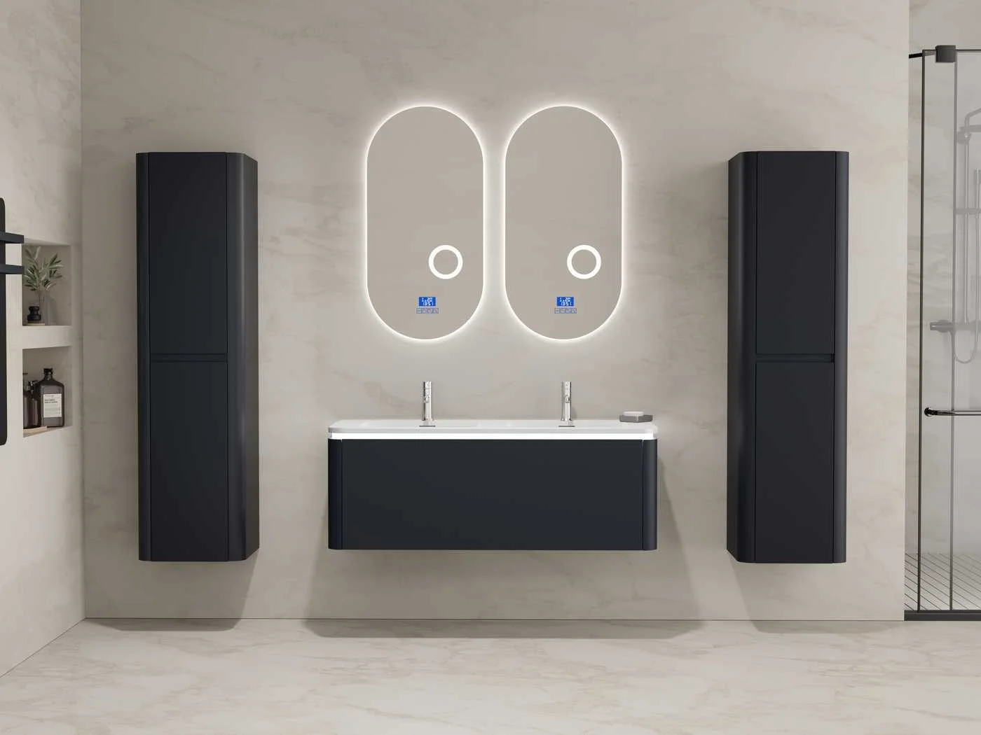 Type: BOSTON1202-BL. Afmetingen Complete set: 1 * Wastafelmeubel - 1200x455x400mm, 1 * Dubbele wasbak - 1205x460x190mm, 2 * Zijkast - 1500x350x350mm, 2* Spiegel- 450x900mm. Voorzien van: LED verlichting in onderkast - 2 kranen inclusief pop-up afvoer – 1 lade met 2 opbergvakken - Softclose lade systeem - LED spiegels met anti-fog systeem - Voorgemonteerde zijkasten en wastafelmeubel. Merk: Vonato Model: Lykke 120 Product type: 2-Persoons 120 cm Hoogte: 40cm Lengte: 46cm Materiaal: Melamine, MDF, metaal Kleur: Zwart Kraan: Inclusief 2 kranen Wastafel: Inclusief dubbele wastafel Waskom: 0 Spiegelkast: Nee Spiegel: Ja Spiegel met verlichting: Ja Verlichting: Ja Onderkast: Ja Lades: 1 Bevestigingsmateriaal: Ja