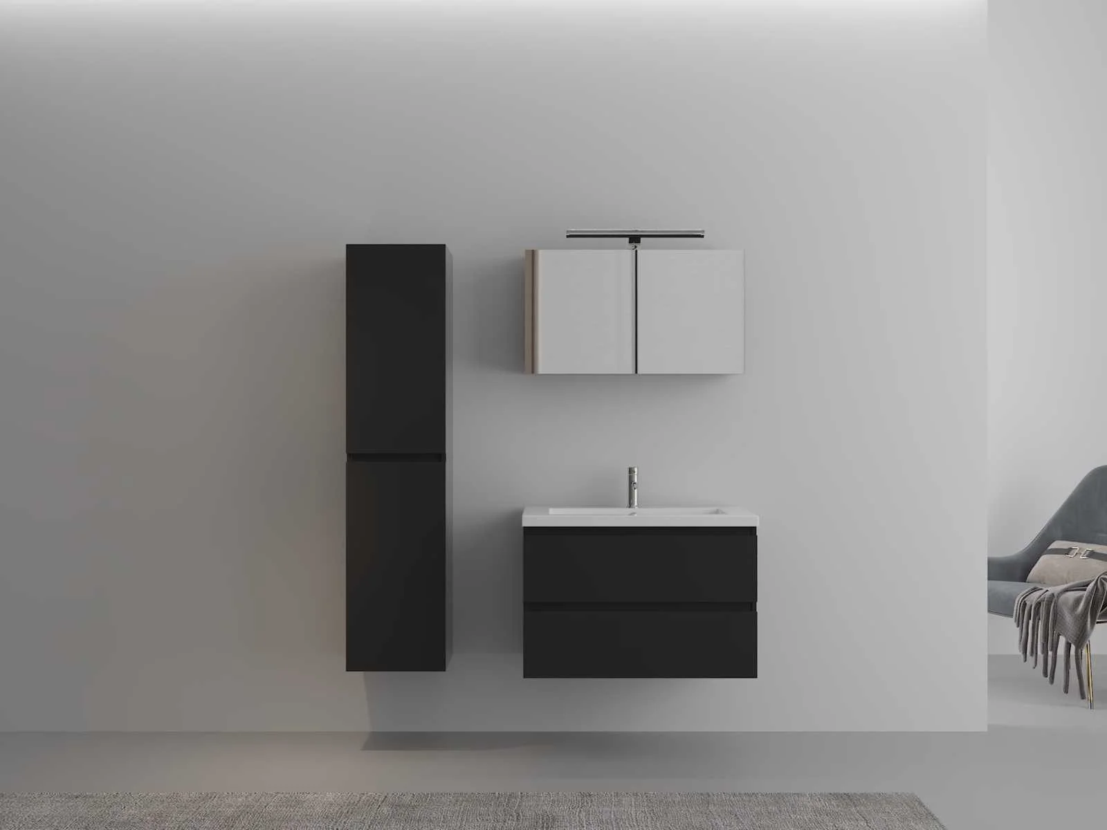 Type: HAVIKLUXWM-2-80-BL. Model: Badkamermeubel 80 cm - hoogglans zwart met witte wasbak. Afmetingen: 1 * Wastafelmeubel - 800x460x520mm, 1 * Wasbak – 800x460x160mm (rand 3 cm), 1 * Zijkast - 1500x350x350mm, 1 * Spiegelkast - 800x450x180mm Voorzien van: Kraan inclusief pop-up drain – 2 lades - Softclose systeem op deurtjes en lades - Giethars wasbak – LED verlichting boven de spiegel – Spiegelkast met 2 deurtjes en 1 plank - Voorgemonteerde zijkasten en wastafelmeubel. Merk: Vonato Model: Classic 5 Product type: 1-Persoons 80 cm Hoogte: 46cm Lengte: 52cm Materiaal: 18 mm MFC Kleur: Hoogglans zwart Kraan: Inclusief 1 kraan Wastafel: Inclusief 1 witte wasbak. Waskom: 0 Spiegelkast: Ja Spiegel: Ja Spiegel met verlichting: 0 Verlichting: Ja Onderkast: Ja Lades: 2 Bevestigingsmateriaal: Ja